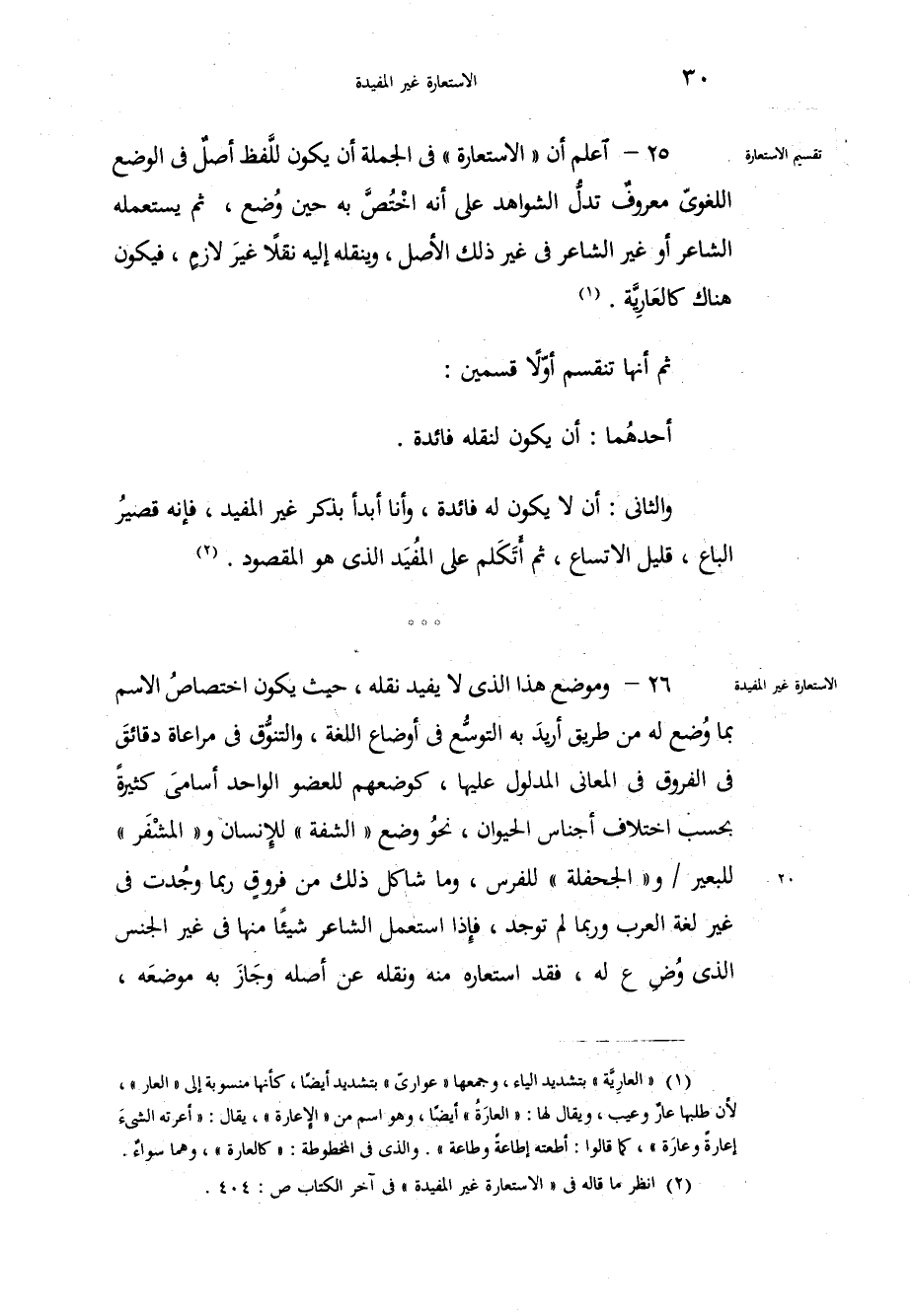 ثم إنها تنقسم أوّلاً قسمين، أحدهُما: أن يكون لنقله فائدة، والثاني: أن لا يكون له فائدة، وأنا أبداً بذكر غير المفيد، فإنه قصيرُ الباع، قليل الاتساع، ثم أَتَكلم على المُفيَد الذي هو المقصود، وموضع هذا الذي لا يفيد نقله، حيث يكون اختصاصُ الاسم بما وُضع له من طريق أريدَ به التوسُّع في أوضاع اللغة، والتنوُّق في مراعاة دقائق في الفروق في المعاني المدلول عليها، كوضعهم للعضو الواحد أساميَ كثيرةً بحسب اختلاف أجناس الحيوان، نحوَ وضع الشفة للإنسان والمشْفَر للبعير والجحفلة للفرس، وما شاكل ذلك من فروقٍ ربما وجُدت في غير لغة العرب وربما لم توجد، فإذا استعمل الشاعر شيئاً منها في غير الجنس الذي وُضِع له، فقد استعاره منه ونقله عن أصله وجَازَ به موضعَه،