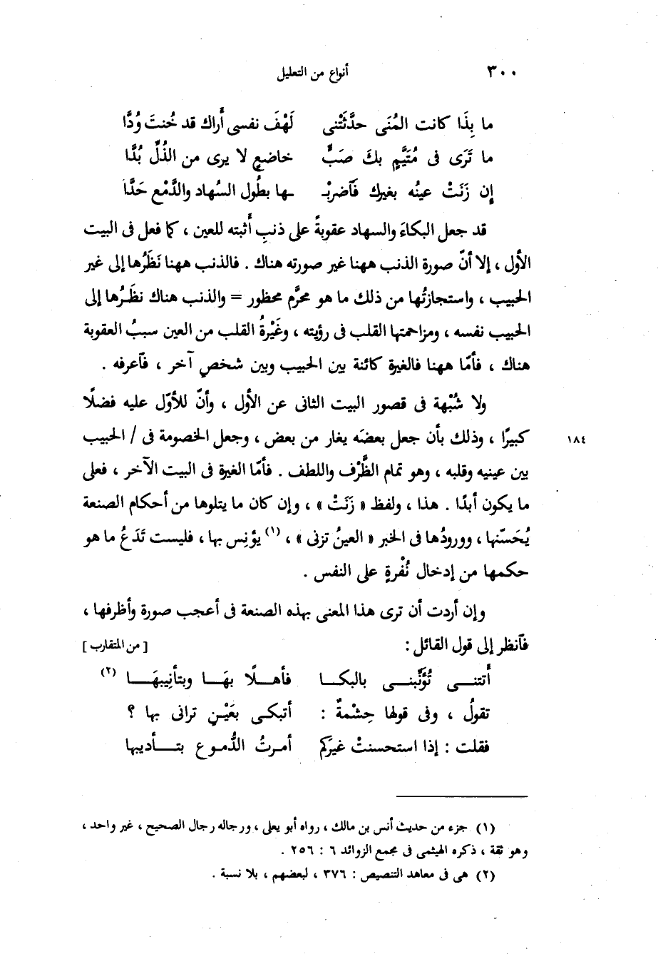 قد جعل البكاءَ والسهاد عقوبةً على ذنبِ أَثبته للعين، كما فعل في البيت الأول، إلا أنّ صورة الذنب هاهنا غير صورته هناك، فالذنب هاهنا نَظَرُها إلى غير الحبيب، واستجازتُها من ذلك ما هو محرَّم محظور والذنب هناك نظَرُها إلى الحبيب نفسه، ومزاحمتها القلب في رؤيته، وغَيْرةُ القلب من العين سببُ العقوبة هناك، فأمّا هاهنا فالغيرة كائنة بين الحبيب وبين شخصٍ آخر فاعرفه. ولا شُبْهة في قصور البيت الثاني عن الأول، وأنّ للأوّل عليه فضلاً كبيراً، وذلك بأن جعل بعضَه يغار من بعض، وجعل الخصومة في الحبيب بين عينيه وقلبه، وهو تمام الظَّرْف واللطف، فأمّا الغيرة في البيت الآخر، فعلى ما يكون أبداً، هذا ولفظ زَنَتْ، وإن كان ما يتلوها من أحكام الصنعة يُحَسّنها، وورودُها في الخبر العينُ تزني، ويؤنِس بها، فليست تَدَعُ ما هو حكمها من إدخال نُفْرةٍ على النفس. وإن أردت أن ترى هذا المعنى بهذه الصنعة في أعجب صورة وأظرفها، فانظر إلى قول القائل: