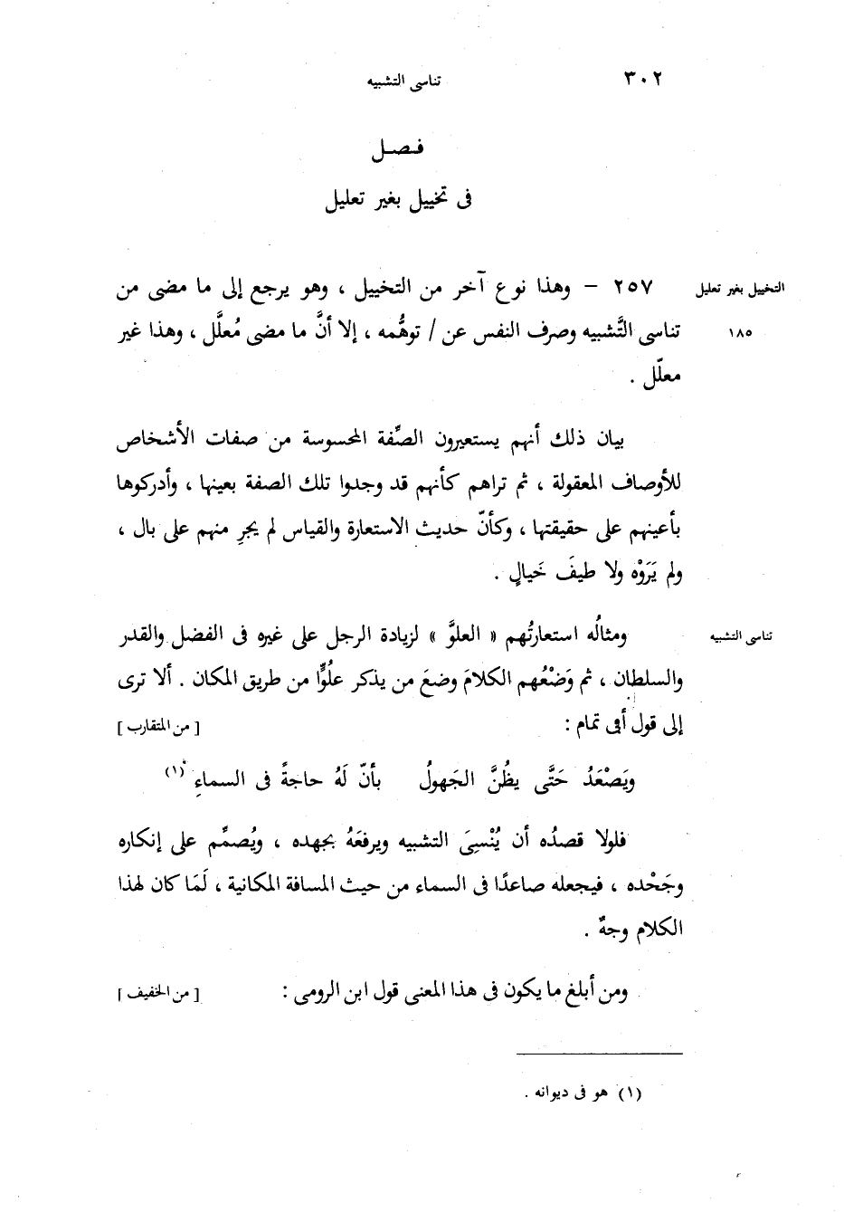 فلولا قصده أن يُنْسِيَ الشبيه ويرفعَه بجهده، ويُصمِّم على إنكاره وجَحْده، فيجعله صاعداً في السماء من حيث المسافة المكانية، لمَا كان لهذا الكلام وجهٌ. ومن أبلغ ما يكون في هذا المعنى قول ابن الرومي: