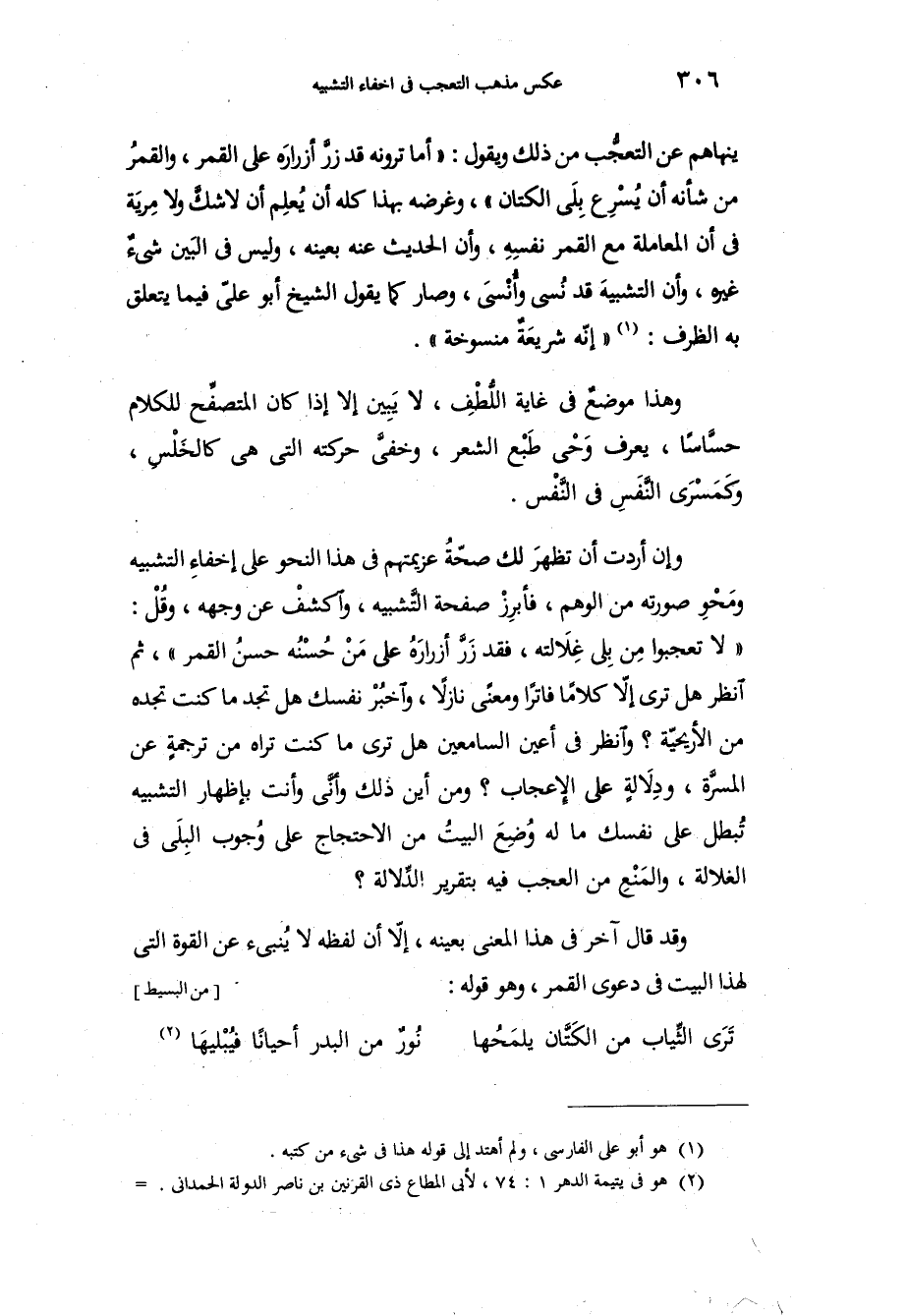 ينهاهم عن التعجُّب من ذلك ويقول أما ترونه قد زرَّ أزرارَه على القمر، والقمرُ من شأنه أن يُسْرِع بِلَى الكتان، وغرضه بهذا كله أن يُعلِم أن لا شكَّ ولا مِريَة في أن المعاملة مع القمر نفسِهِ، وأن الحديث عنه بعينه، وليس في البَين شيءٌ غيره، وأن التشبيهَ قد نُسي وأُنْسيَ، وصار كما يقول الشيخ أبو عليّ فيما يتعلق به الظرف: إنّه شريعَةٌ منسوخة. وهذا موضعٌ في غاية اللُّطْفِ، لا يَبين إلا إذا كان المتصفِّح للكلام حسَّاساً، يعرف وَحْي طَبْع الشعر، وخفيَّ حركته التي هي كالخَلْسِ، وكَمَسْرَى النّفْسِ في النّفْس. وإن أردت أن تظهرَ لك صحّةُ عزيمتهم في هذا النحو على إخفاءِ التشبيه ومَحْوِ صورته من الوهم، فأبرِزْ صفة التَّشبيه، واكشفْ عن وجهه، وقُلْ لا تعجبوا مِن بِلى غِلاَلته، فقد زرَّ أزرارَهُ على مَنْ حُسْنُه حسنُ القمر، ثم انظر هل ترى إلاّ كلاماً فاتراً ومعنًى نازلاً، واخبُرْ نفسك هل تجد ما كنت تجده من الأريحيّة؟ وانظر في أعين السامعين هل ترى ما كنت تراه من ترجمةٍ عن المسرَّة، ودِلاَلةٍ على الإعجاب؟ ومن أين ذلك وأنَّى وأنت بإظهار التشبيه تُبطل على نفسك ما له وُضِعَ البيتُ من الاحتجاج على وُجوب البِلَى في الغلالة، والمَنْعِ من العجب فيه بتقرير الدِّلالة. وقد قال آخر في هذا المعنى بعينه، إلاّ أن لفظه لا يُنبئ عن القوة التي لهذا البيت في دعوى القمر، وهو قوله: