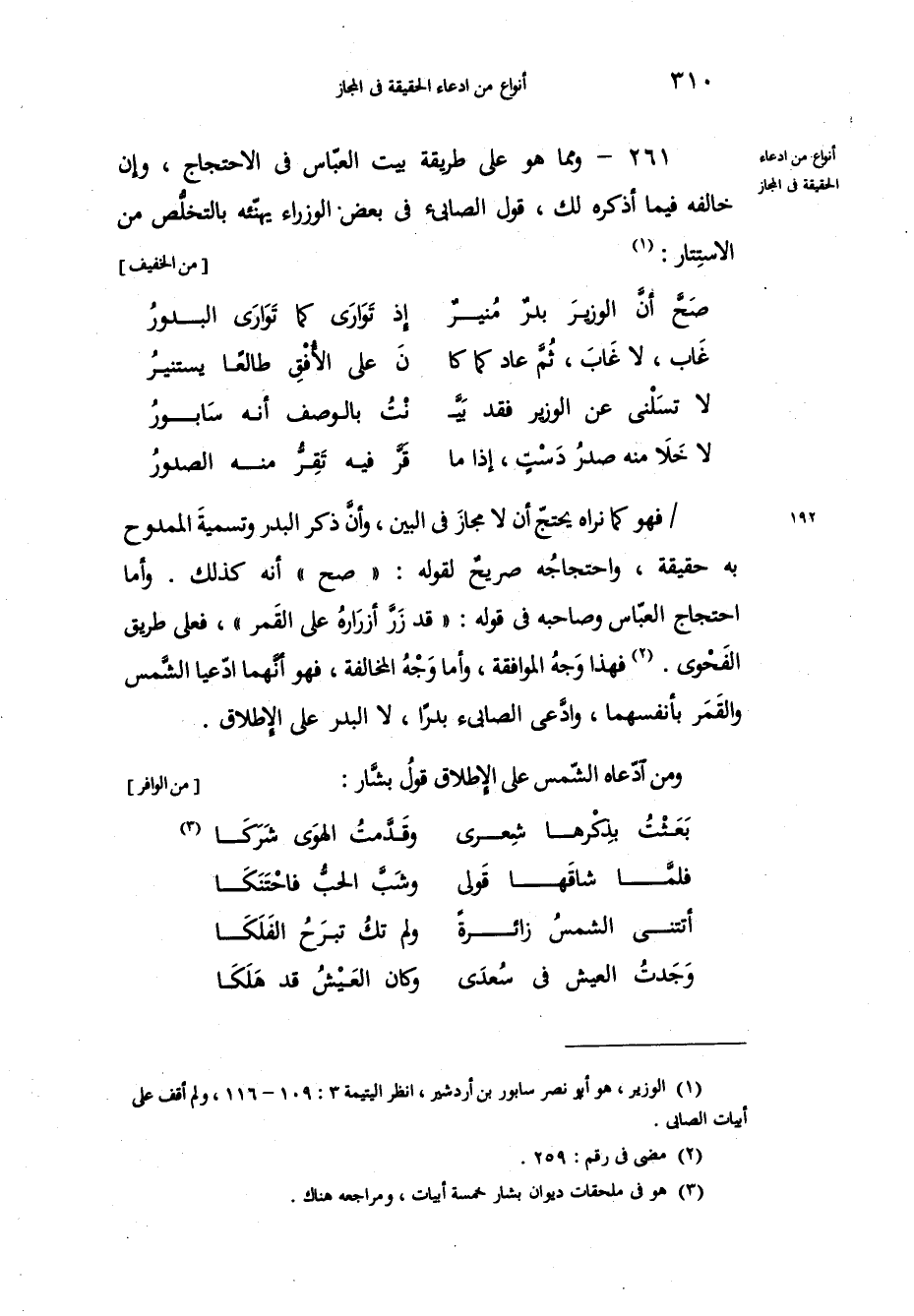 فهو كما نراه يحتجّ أن لا مجازَ في البين، وأنَّ ذكر البدر وتسميةَ الممدوح به حقيقة، واحتجاجُه صريحٌ لقوله صح أنه كذلك، وأما احتجاج العبّاس وصاحبه في قوله قد زرَّ أزرَارهُ على القَمر، فعلى طريق الفَحْوى، فهذا وَجهُ الموافقة، وأما وَجْهُ المخالفة، فهو أنَّهما ادّعيا الشَّمس والقَمَر بأنفسهما، وادَّعى الصابئ بدراً، لا البدر على الإطلاق. ومن ادّعاه الشمس على الإطلاق قولُ بشَّار: