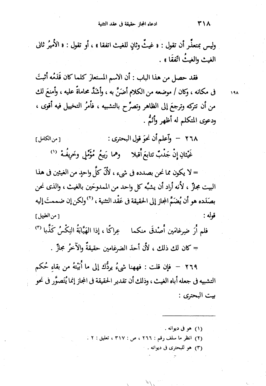 لا يكون مما نحن بصدده في شيء، لأنّ كلَّ واحدٍ من الغيثين في هذا البيت مجازٌ، لأنه أراد أن يشبِّه كل واحد من الممدوحَين بالغيث، والذي نحن بصَدَده، هو أن يُضَمَّ المجاز إلى الحقيقة في عَقْد التثنية، ولكن إن ضممتَ إليه قوله: