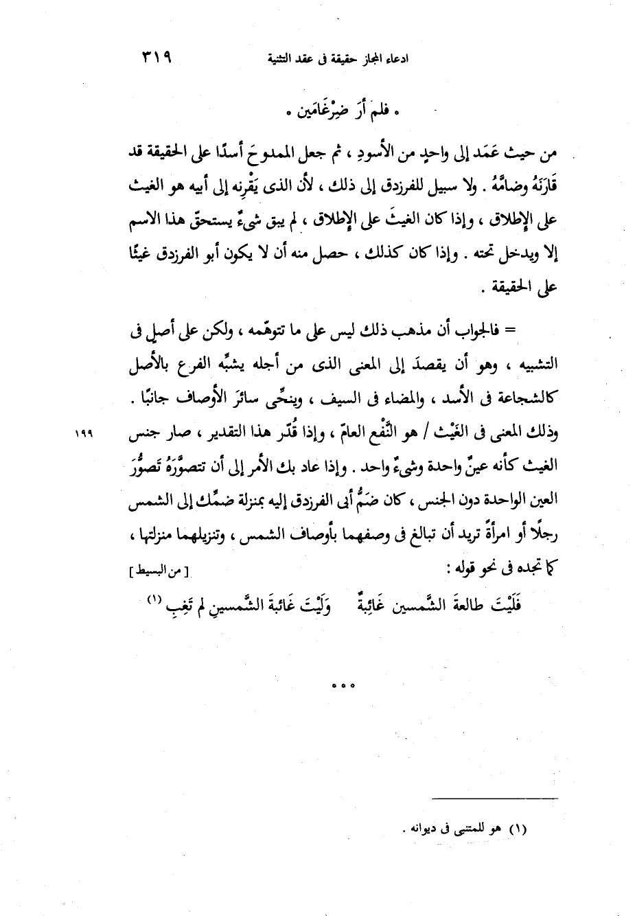 فلم أرَ ضِرْغَامَين " من حيث عَمَد إلى واحدٍ من الأسودِ، ثم جعل الممدوحَ أسداً على الحقيقة قد قَارَنَهُ وضامَّهُ، ولا سبيل للفرزدق إلى ذلك، لأن الذي يَقْرِنه إلى أبيه هو الغيث على الإطلاق، وإذا كان الغيثَ على الإطلاق، لم يبق شيءٌ يستحقّ هذا الاسم إلا ويدخل تحته، وإذا كان كذلك، حصل منه أن لا يكون أبو الفرزدق غيثاًً على الحقيقة، فالجواب أن مذهب ذلك ليس على ما تتوهّمه، ولكن على أصلٍ هو التشبيه، وهو أن يقصدَ إلى المعنى الذي من أجله يشبِّه الفرع بالأصل كالشجاعة في الأسد، والمضاء في السيف، وينحِّي سائرَ الأوصاف جانباً، وذلك المعنى في الغَيْث هو النّفْع العامّ، وإذا قُدّر هذا التقدير، صار جنس الغيث كأنه عينٌ واحدة وشيءٌ واحد، وإذا عاد بك الأمر إلى أن تتصوَّرَهُ تَصوُّرَ العين الواحدة دون الجنس، كان ضَمُّ أبي الفرزدق إليه بمنزلة ضمِّك إلى الشمس رجلاً أو امرأةً تريد أن تبالغ في وصفهما بأوصاف الشمس، وتنزيلهما منزلتها، كما تجده في نحو قوله: