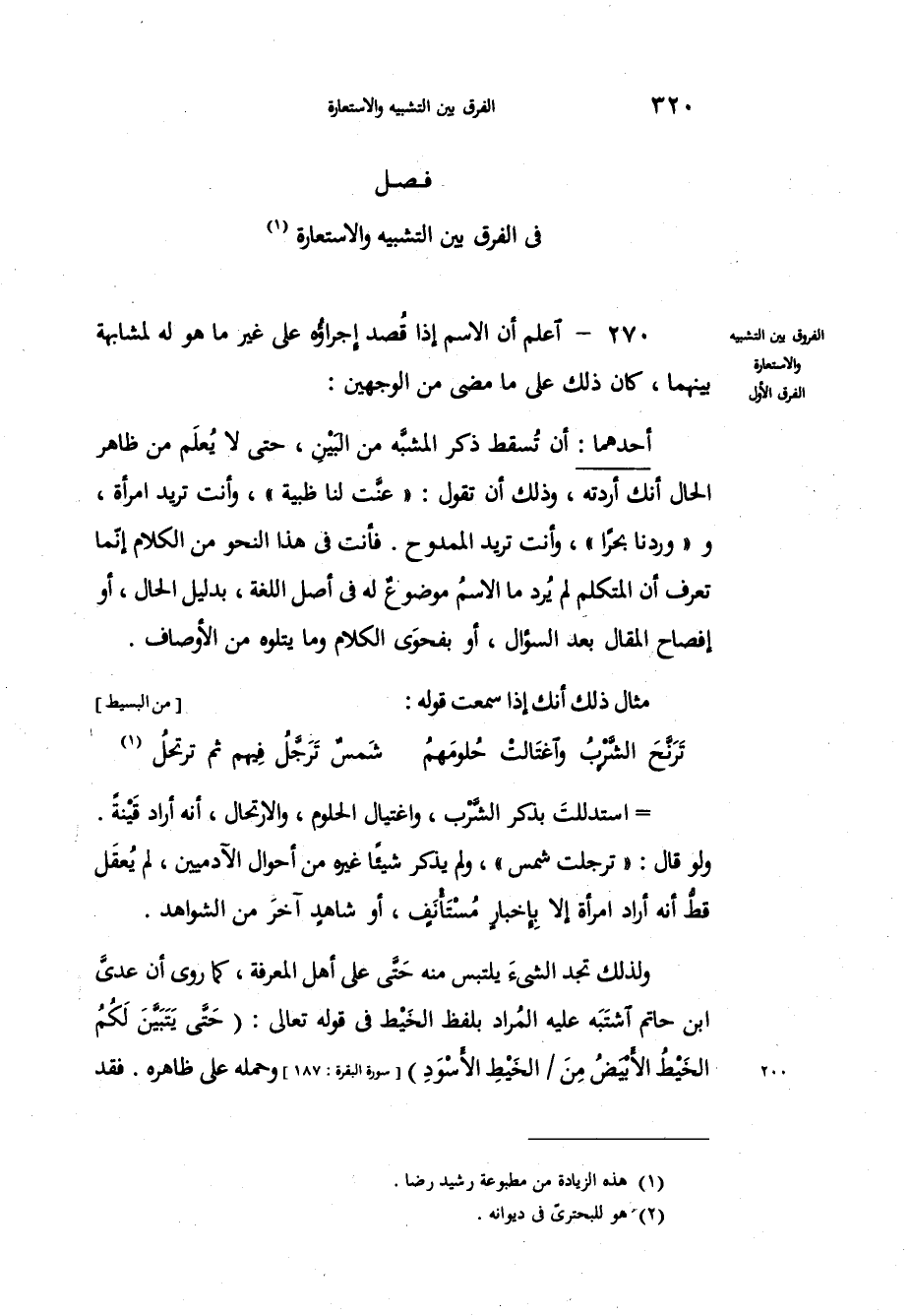 اعلم أن الاسم إذا قُصد إجراؤُه على غير ما هو له لمشابهة بينهما، كان ذلك على ما مضى من الوجهين: أحدهما أن تُسقط ذكر المشبَّه من البَيْنِ، حتى لا يُعلَم من ظاهر الحال أنك أردته، وذلك أن تقول " عنَّت لنا ظبية "، وأنت تريد امرأة، ووردنا براً، وأنت تريد الممدوح، فأنت في هذا النحو من الكلام إنّما تعرف أن المتكلم لم يُرد ما الاسمُ موضوعٌ له في أصل اللغة، بدليل الحال، أو إفصاح المقال بعد السؤال، أو بفحوَى الكلام وما يتلوه من الأوصاف، مثال ذلك أنك إذا سمعت قوله: