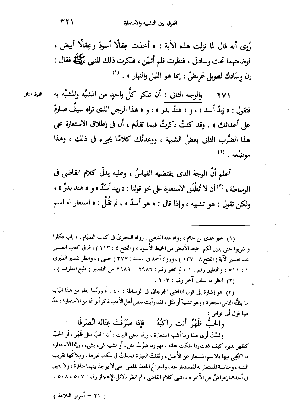رُوى أنه قال لما نزلت هذه الآية أخذت عِقالاً أسودَ وعِقالاً أبيض، فوضعتهما تحت وسادتي، فنظرت فلم أتبيّن، فذكرت ذلك للنبي صلى الله عليه وسلم فقال: " إن وِسَادك لطويل عَرِيضٌ، إنما هو الليل والنهار "، والوجه الثاني: أن تذكر كلَّ واحدٍ من المشبَّه والمشبَّه به فتقول زيدٌ أسد وهندٌ بدر، وهذا الرجل الذي تراه سيفٌ صارمٌ على أعدائك، وقد كنتُ ذكرتُ فيما تقدّم، أن في إطلاق الاستعارة على هذا الضَّرب الثاني بعضُ الشبهة، ووعدتُك كلاماً يجيء في ذلك، وهذا موضعُه. اعلم أنّ الوجهَ الذي يقتضيه القياس، وعليه يدلّ كلام القاضي في الوساطة، أن لا تُطْلَق الاستعارة على نحو قولنا زيد أسَدٌ وهند بدرٌ، ولكن تقول: هو تشبيه، وإذا قال هو أسدٌ، لم تقُلْ استعار له اسم