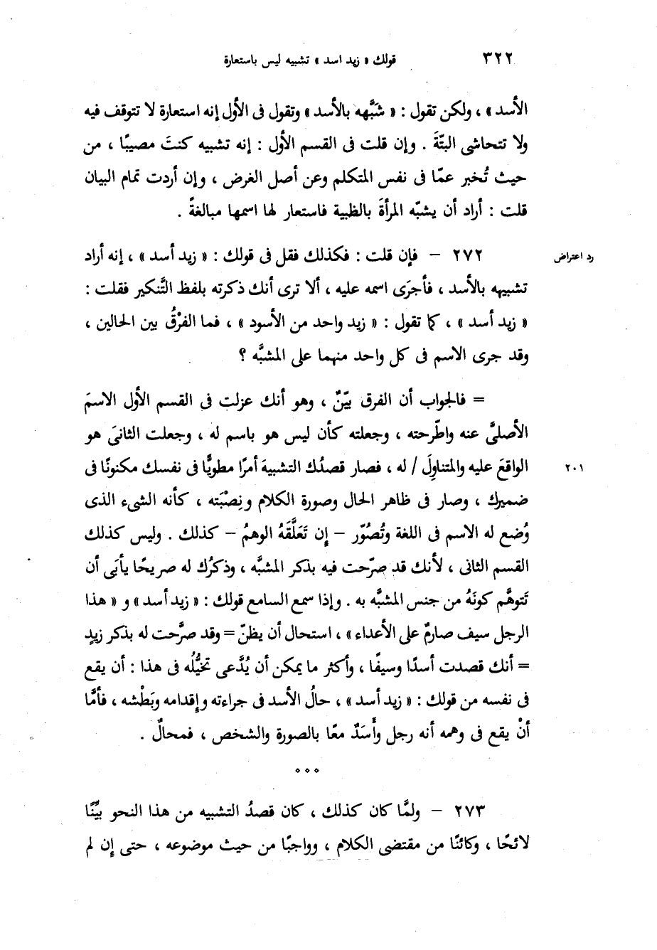 الأسد، ولكن تقول شَبَّهه بالأسد، وتقول في الأول إنه استعارة لا تتوقف فيه ولا تتحاشى البتّةَ، وإن قلت في القسم الأول: إنه تشبيه كنتَ مصيباً، من حيث تُخبر عمّا في نفس المتكلم وعن أصل الغرض، وإن أردت تمام البيان قلت أراد أن يشبّه المرأةَ بالظبية فاستعار لها اسمها مبالغةً. فإن قلت فكذلك فقل في قولك زيد أسد، إنه أراد تشبيهه بالأسد، فأجرَى اسمه عليه، ألا ترى أنك ذكرته بلفظ التَّنكير فقلت زيد أسد، كما تقول زيد واحد من الأسود، فما الفرْقُ بين الحالين، وقد جرى الاسم في كل واحد منهما على المشبَّه. فالجواب أن الفرق بيّنٌ وهو أنك عزلت في القسم الأول الاسمَ الأصليَّ عنه واطّرحته، وجعلته كأن ليس هو باسم له، وجعلت الثانيَ هو الواقعَ عليه والمتناوِلَ له، فصار قصدُك التشبيهَ أمراً مطويّاً في نفسك مكنوناً في ضميرك، وصار في ظاهر الحال وصورة الكلام ونِصْبَته، كأنه الشيء الذي وُضع له الاسم في اللغة وتُصُوّر - إن تَعَلَّقَهُ الوهمُ - كذلك، وليس كذلك القسم الثاني، لأنك قد صرّحت فيه بذكر المشبَّه، وذكرُك له صريحاً يأبَى أن تَتوَّهم كونَهُ من جنس المشبَّه به، وإذا سمع السامع قولك زيد أسد وهذا الرجل سيف صارمٌ على الأعداء، استحال أن يظنّ وقد صرَّحت له بذكر زيدٍ أنك قصدت أسداً وسيفاً، وأكثر ما يمكن أن يُدَّعى تخيُّلُه في هذا أن يقع في نفسه من قولك زيد أسد، حالُ الأسد في جراءته وإقدامه وبَطْشه، فأمَّا أنْ يقع في وهمه أنه رجل وأَسَدٌ معاً بالصورة والشخص فمحالٌ. ولمَّا كان كذلك، كان قصدُ التشبيه من هذا النحو بيِّناً لائحاً، وكائناً من مقتضى الكلام، وواجباً من حيث موضوعه، حتى إن لم