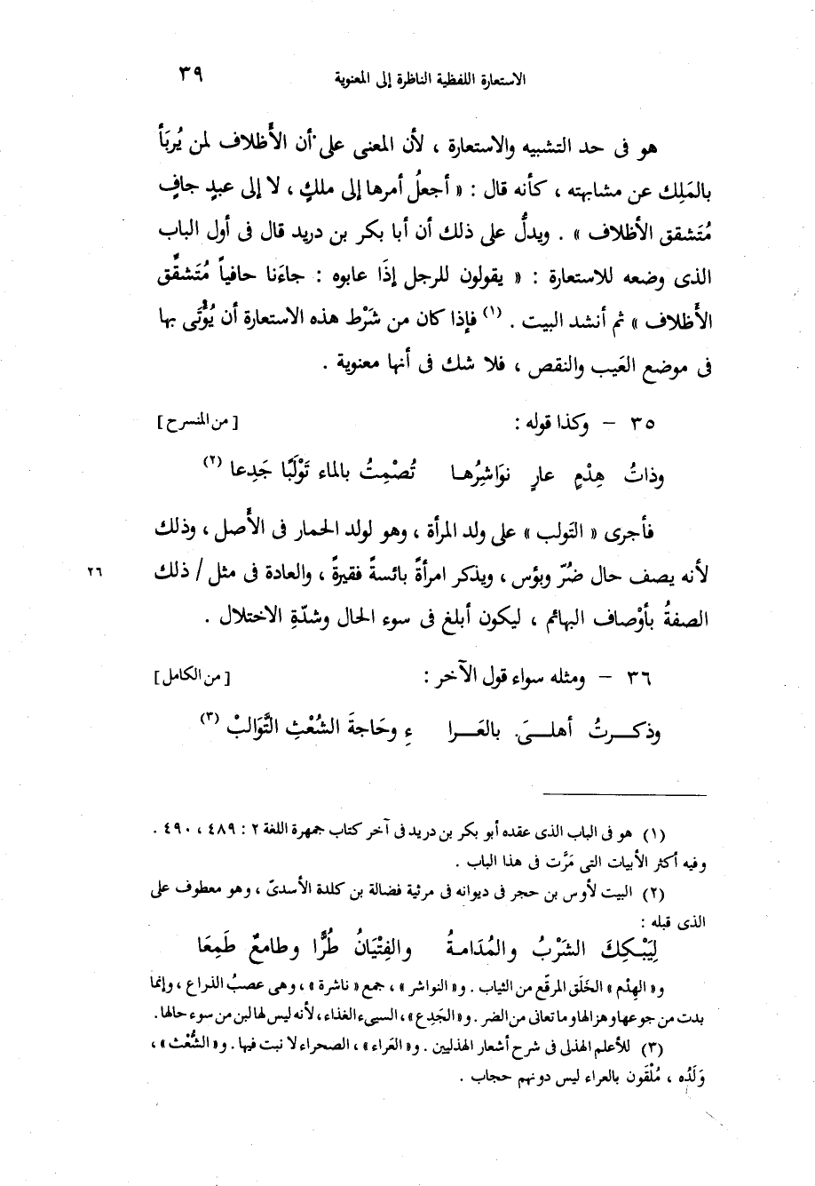 هو في حد التشبيه والاستعارة، لأن المعنى على أن الأظلاف لمن يُربَأ بالمَلِك عن مشابهته، كأنه قال: أجعلُ أمرها إلى ملكٍ، لا إلى عبدٍ جافٍ مُتَشقق الأظلاف، ويدلُّ على ذلك أن أبا بكر بن دريد قال في أول الباب الذي وضعه للاستعارة: يقولون للرجل إذا عابوه: جاءَنا حافياً مُتَشقِّق الأظلاف ثم أنشد البيت، فإذا كان من شَرْط هذه الاستعارة أن يُؤْتَى بها في موضع العَيب والنقص، فلا شك في أنها معنوية وكذا قوله: