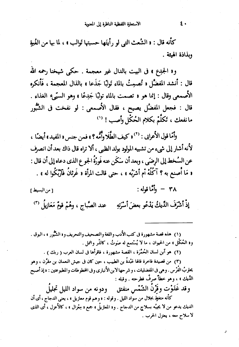 كأنه قال: الشُعث التي لو رأيتَها حسبتها تَوالب، لما بها من الغُبرة وبذاذة الهيئة، والجدِع في البيت بالدال غير معجمة، حكى شيخنا رحمه الله قال: أنشد المفضَّل تُصمِتُ بالماء تَولباً جَذَعاً بالذال المعجمة، فأنكره الأصمعي وقال: إنما هو تصمت بالماء تولباً جَدِعاً وهو السيّئ الغذاء، قال: فجعل المفضَّل يصيح، فقال الأصمعي: لو نفخت في الشَّبُّور ما نفعك، تَكلَّمْ بكلام الحُكْل وأصب. وأما قول الأعرابي: كيف الطَّلا وأُمُّه؟ فمن جنس المفيد أيضاً، لأنه أشار إلى شيء من تشبيه المولود بولد الظبي، ألا تراه قال ذاك بعد أن انصرف عن السُخط إلى الرضَى، وبعد أن سَكَن عنه فَورةُ الجوع الذي دعاه إلى أن قال: مَا أصنع به؟ آكُلُهُ أم أشرَبُه حتى قالت المرأة " غَرثانُ فارْبُكُوا له "، وأمَّا قوله: