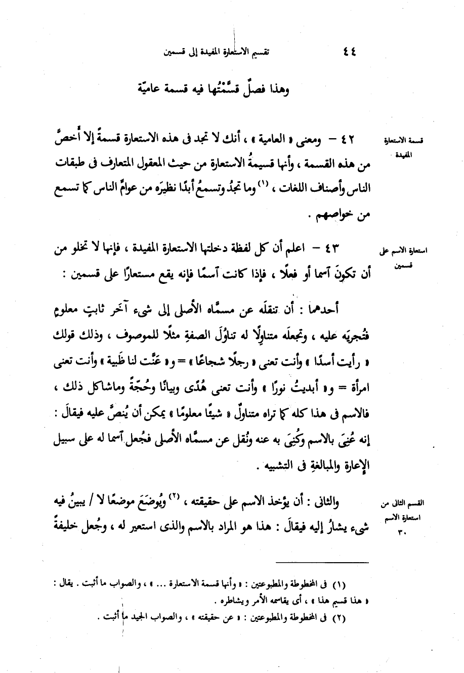 وهذا فصلٌ قسَّمْتُها فيه قسمة عامية ومعنى العامية، أنك لا تجد في هذه الاستعارة قسمةً إلا أخصَّ من هذه القسمة، وأنها قسيمةُ الاستعارة من حيث المعقول المتعارف في طبقات الناس وأصناف اللغات، وما تجدُ وتسمعُ أبداً نظيرَه من عوامِّ الناس كما تسمع من خواصهم