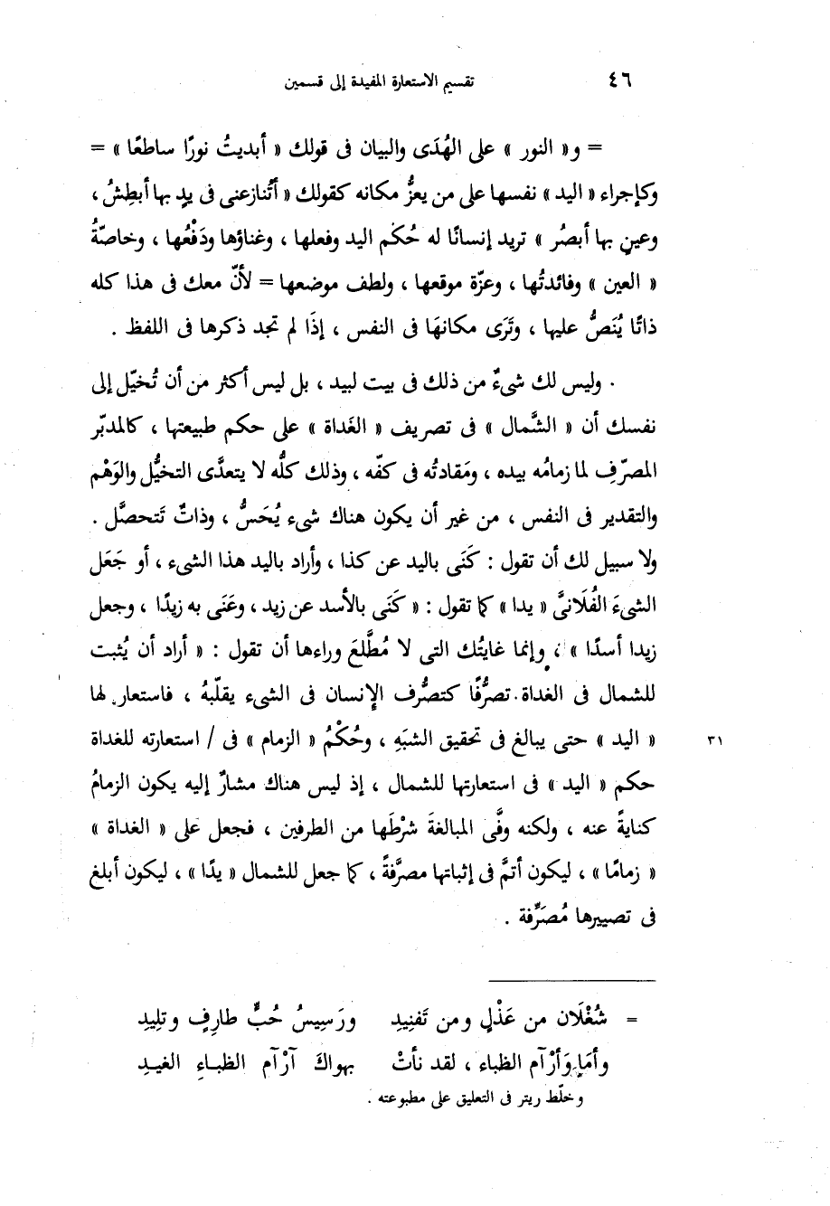 والنور على الهُدَى والبيان في قولك أبديتُ نوراً ساطعاً وكإجراء اليد نفسها على من يعزُّ مكانه كقولك أتنازعني في يدٍ بها أبطِشُ، وعين بها أبصرُ تريد إنساناً له حُكْم اليد وفعلها، وغناؤها ودَفْعُها، وخاصّةُ العين وفائدتُها، وعزّة موقعها، ولطف موضعها لأنّ معك في هذا كله ذاتاً يُنَصُّ عليها، تَرَى مكانَها في النفس، إذَا لم تجد ذكرها في اللفظ، وليس لك شيءٌ من ذلك في بيت لبيد، بل ليس أكثر من أن تُخَيّل إلى نفسك أن الشَّمال في تصريف الغَداة على حكم طبيعتها، كالمدبّر المصرِّفِ لما زمامُه بيده، ومَقادتُهُ في كفّه، وذلك كلُّه لا يتعدَّى التخيُّلُ والوَهْم والتقدير في النفس، من غير أن يكون هناك شيء يُحَسُّ، وذاتٌ تتحصَّل، ولا سبيل لك أن تقول: كَنَى باليد عن كذا، وأراد باليد هذا الشيء، أو جَعَل الشيءَ الفُلاَنيَّ يداً كما تقول: كَنَى بالأسد عن زيد، وعَنَى به زَيداً، وجعل زيداً أسداً، وإنما غايتُك التي لا مُطَّلعَ وراءها أن تقول: أراد أن يُثبت للشمال في الغداة تصرُّفاً كتصرُّف الإنسان في الشيء يقلّبهُ، فاستعار لها اليد حتى يبالغ في تحقيق الشبَهِ، وحُكْمُ الزمام في استعاراته للغداة حكم اليد في استعارتها للشمال، إذ ليس هناك مشارٌ إليه يكون الزمامُ كنايةً عنه، ولكنه وفَّى المبالغةَ شَرْطها من الطرفين، فجعل على الغداة زماماً، ليكون أتمَّ في إثباتها مصرَّفةً، كاجعل للشمال يداً، ليكون أبلغ في تصييرها مُصَرِّفة،