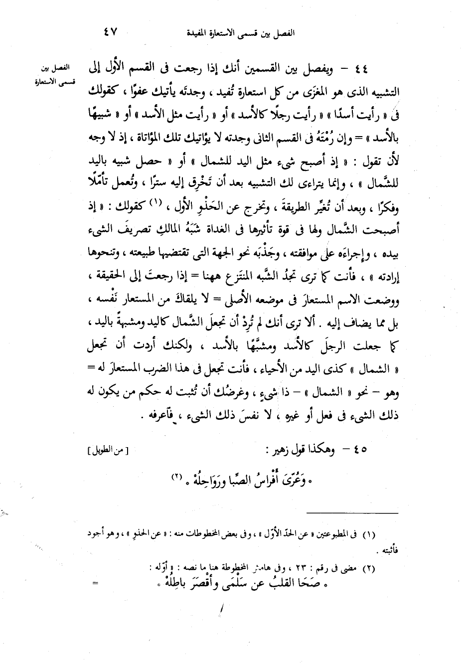 ويفصل بين القسمين أنك إذا رجعت في القسم الأول إلى التشبيه الذي هو المغزَى من كل استعارة تُفيد، وجدتَه يأتيك عفواً، كقولك في رأيت أسداً رأيت رجلاً كالأسد أو رأيت مثل الأسد أو شبيهاً بالأسد وإن رُمْتَهُ في القسم الثاني وجدته لا يؤاتيك تلك المؤاتاة، إذ لا وجه لأن تقول: إذا أصبح شيء مثل اليد للشمال أو حصل شبيه باليد للشَّمال، وإنما يتراءى لك التشبيه بعد أن تَخْرِق إليه ستراً، وتُعمل تأمّلاً وفكرْاً، وبعد أن تُغيِّر الطريقةَ، وتخرج على الحذْوِ الأول، كقولك: إذ أصبحت الشَّمال ولها في قوة تأثيرها في الغداة شَبَهُ المالكِ تصريف الشيء بيده، وإجراءَه على موافقته، وجَذْبَه نحو الجهة التي تقتضيها طبيعته، وتنحوها إرادته، فأنت كما ترى تجدُ الشَّبه المنتَزع ها هنا إذا رجعتَ إلى الحقيقة، ووضعت الاسم المستعارَ في موضعه الأصلي لا يلقاكَ من المستعار نَفْسه، بل مما يضاف إليه، ألا ترى أنك لم تُرِدْ أن تجعلَ الشَّمال كاليد ومشبهةً باليد، كما جعلت الرجلَ كالأسد ومشبَّهاً بالأسد، ولكنك أردت أن تجعل الشمال كذي اليد من الأحياء، فأنت تجعل في هذا الضرب المستعارَ له وهو نحو الشمال ذا شيءٍ، وغرضُك أن تُثبت له حكم من يكون له ذلك الشيء في فعل أو غيره، لا نفسَ ذلك الشيء فاعرفه. وهكذا قول زهير: " وَعُرّيَ أفْراسُ الصّبا ورَوَاحِلُه "