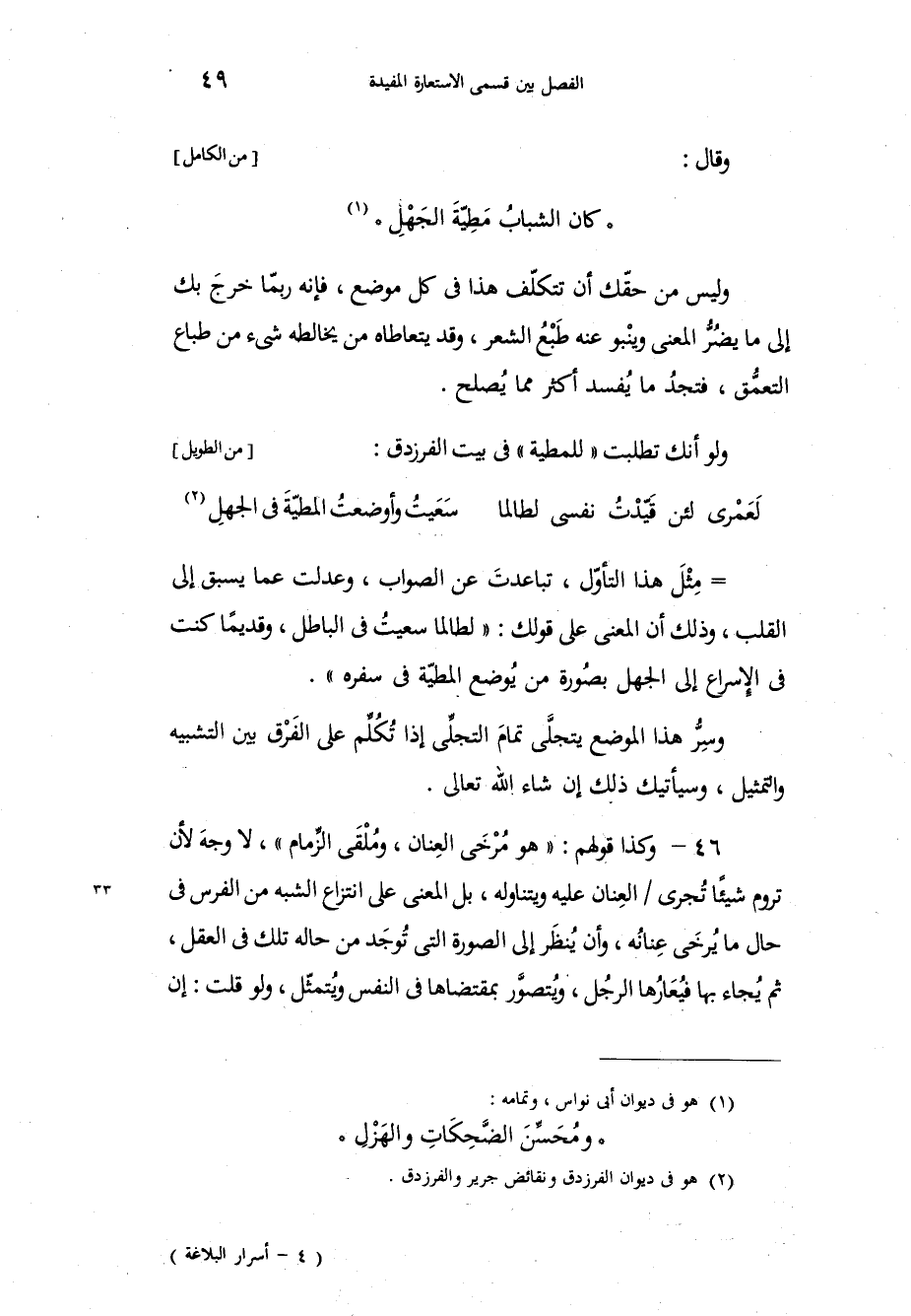 وقال " كان الشبابُ مَطِيّةَ الجَهْل " وليس من حقّك أن تتكلّف هذا في كل موضع، فإنه ربّما خرجَ بك إلى ما يضُرُّ المعنى وينْبو عنه طَبْعُ الشعر، وقد يتعاطاه من يخالطه شيء من طباع التعمُّق، فتجدُ ما يُفسد أكثر مما يُصلح، ولو أنك تطلبت للمطية في بيت الفرزدق: