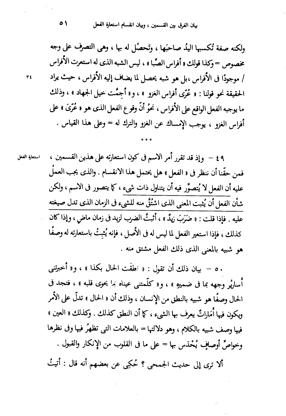 ولكنه صفته تُكسبها اليدُ صاحبَها، وتَحصُلُ له بها، وهي التصرف على وجه مخصوص وكذا قولك أفراس الصِّبا، ليس الشبه الذي له استعرت الأفراس موجوداً في الأفراس، بل هو شبه يحصل لما يضاف إليه الأفراس، حيث يراد الحقيقة نحو قولنا " عُرّي أفراس الغزو، وأجِمَّت خيل الجهاد "، وذلك ما يوجبه الفعل الواقع على الأفراس، نحو أنّ وقوع الفعل الذي هو عُرّيَ على أفراس الغزو، يوجب الإمساك عن الغزو والترك له وعلى هذا القياس. وإذ قد تقرر أمر الاسم في كون استعارته على هذين القسمين، فمن حقّنا أن ننظر في الفعل هل يحتمل هذا الانقسام، والذي يجب العملُ عليه أن الفعل لا يُتصوَّر فيه أن يتناول ذات شيء، كما يتصور في الاسم، ولكن شأن الفعل أن يُثبت المعنى الذي اشتُقَّ منه للشيء في الزمان الذي تدل صيغته عليه، فإذا قلت: ضرَبَ زيدٌ، أثبتَّ الضرب لزيد في زمان ماضٍ، وإذا كان كذلك، فإذا استعير الفعل لما ليس له في الأصل، فإنه يُثبتُ باستعارته له وصفاً هو شبيه بالمعنى الذي ذلك الفعل مشتق منه. بيان ذلك أن تقول: نطقَت الحال بكذا، وأخبرتني أساريرُ وجهه بما في ضميره، وكلّمتني عيناه بما يحوي قلبه، فتجد الحال وصفاً هو شبيه بالنطق من الإنسان، وذلك أن الحال تدلّ على الأمر ويكون فيها أَمَاراتٌ يعرف بها الشيء، كما أن النطق كذلك، وكذلك العين فيها وصف شبيه بالكلام، وهو دلالتها بالعلامات التي تظهرُ فيها وفي نظرها وخواصّ أوصافٍ يُحْدَس بها على ما في القلوب من الإنكار والقبول، ألا ترى إلى حديث الجمحي؟ حُكِي عن بعضهم أنه قال: أتيتُ