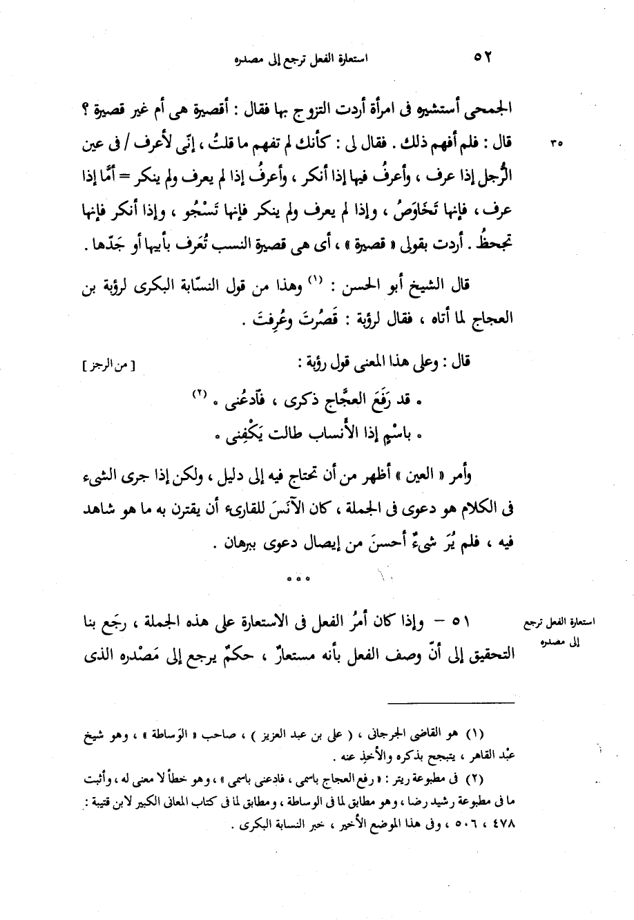 وأمر العين أظهر من أن تحتاج فيه إلى دليل، ولكن إذا جرى الشيء في الكلام هو دعوى في الجملة، كان الآنس للقارئ أن يقترن به ما هو شاهد فيه، فلم يُرَ شيءٌ أحسنَ من إيصال دعوى ببرهان. وإذا كان أمرُ الفعل في الاستعارة على هذه الجملة، رجَع بنا التحقيق إلى أنّ وصف الفعل بأنه مستعارٌ، حكمٌ يرجع إلى مَصْدره الذي