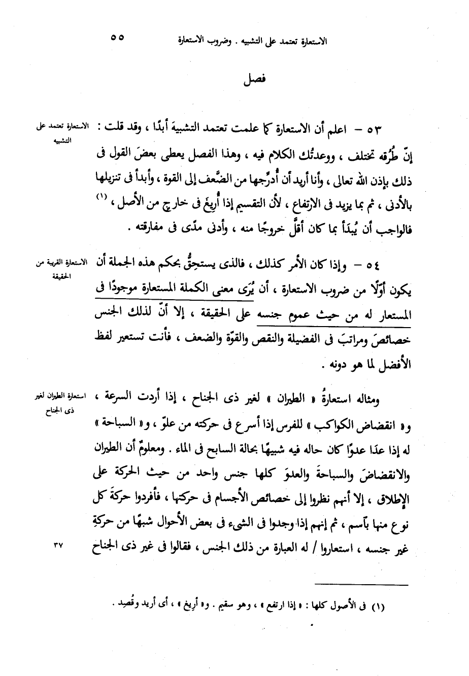 اعلم أن الاستعارة كما علمت تعتمد التشبيهَ أبداً، وقد قلت: إنّ طُرُقه تختلف، ووعدتُك الكلام فيه، وهذا الفصل يعطي بعضَ القول في ذلك بإذن الله تعالى، وأنا أريد أن أُدرِّجها من الضَّعف إلى القوة، وأبدأ في تنزيلها بالأدنى، ثم بما يزيد في الارتفاع، لأن التقسيم إذا أُريغَ في خارج من الأصل، فالواجب أن يُبدَأ بما كان أقلَّ خروجاً منه، وأدنى مدًى في مفارقته، وإذا كان الأمر كذلك، فالذي يستحِقُّ بحكم هذه الجملة أن يكون أوّلاً من ضروب الاستعارة، أن يُرَى معنى الكلمة المستعارة موجوداً في المستعار له من حيث عموم جنسه على الحقيقة، إلا أنّ لذلك الجنس خصائص ومراتبَ في الفضيلة والنقص والقوّة والضعف، فأنت تستعير لفظ الأفضل لما هو دونه، ومثاله استعارةُ الطيران لغير ذي الجناح، إذا أردت السرعة، وانقضاض الكواكب للفرس إذا أسرع في حركته من علوّ، والسباحة له إذا عدَا عدواً كان حاله فيه شبيهاً بحالة السابح في الماء، ومعلومٌ أن الطيران والانقضاضَ والسباحةَ والعدوَ كلها جنس واحد من حيث الحركة على الإطلاق، إلا أنهم نظروا إلى خصائص الأجسام في حركتها، فأفردوا حركةَ كل نوع منها باسم، ثم إنهم إذا وجدوا في الشيء في بعض الأحوال شبهاً من حركةِ غير جنسه، استعاروا له العبارة من ذلك الجنس، فقالوا في غير ذي الجناح