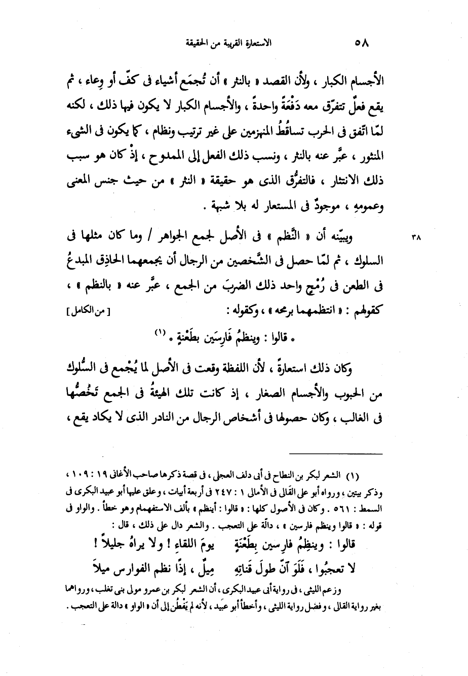 الأجسام الكبار، ولأن القصد بالنثر أن تُجمَعُ أشياء في كفّ أو وِعاء، ثم يقع فعلٌ تتفرّق معه دَفْعَةً واحدةً، والأجسام الكبار لا يكون فيها ذلك، لكنه لمّا اتَّفق في الحرب تساقُطُ المنهزمين على غيرترتيب ونظام، كما يكون في الشيء المنثور، عبَّر عنه بالنثر، ونسب ذلك الفعل إلى الممدوح، إذْ كان هو سبب ذلك الانتثار، فالتفرُّق الذي هو حقيقة النثر من حيث جنس المعنى وعمومِه، موجودُ في المستعار له بلا شبهة، ويبيّنه أن النَّظم في الأصل لجمع الجواهر وما كان مثلها في السلوك، ثم لمّا حصل في الشَّخْصَين من الرجال أن يجمعهما الحاذِق المبدعُ في الطعن في رُمْحٍ واحد ذلك الضربَ من الجمع، عبَّر عنه بالنَّظم، كقولهم: انتظمها برمحه، وكقوله: