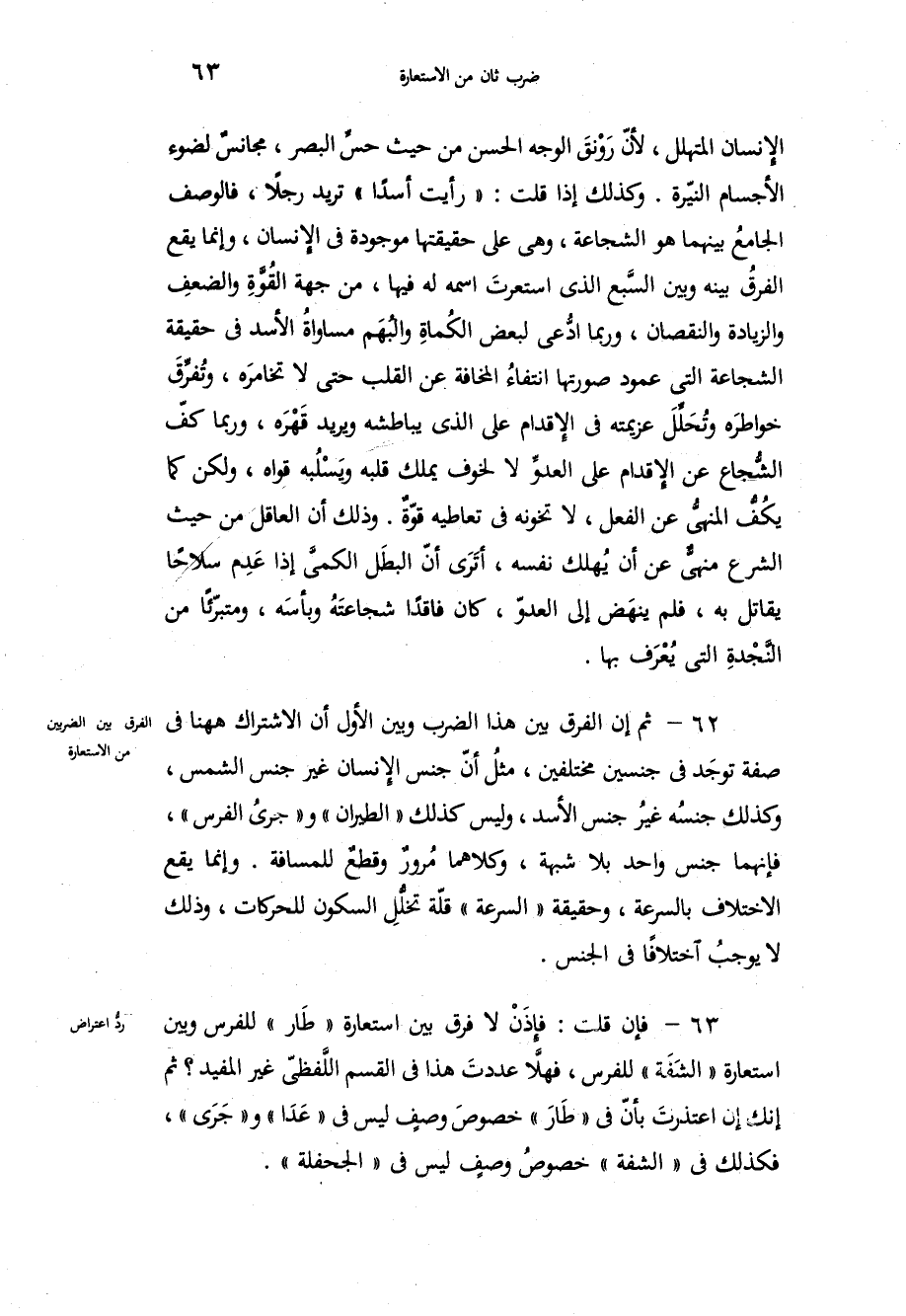 الإنسان المتهلل، لأنّ رَوْنقَ الوجه الحسن من حيث حسنُ البصر، مجانسٌ لضوء الأجسام النيّرة، وكذلك إذا قلت: رأيت أسداً تريد رجلاً، فالوصف الجامعُ بينهما هو الشجاعة، وهي على حقيقتها موجودة في الإنسان، وإنما يقع الفرقُ بينه وبين السَّبع الذي استعرتَ اسمه له فيها، من جهةً القُوَّة والضعفِ والزيادة والنقصان، وربما ادُّعي لبعض الكُماةِ والبُهَم مساواةُ الأسد في حقيقة الشجاعة التي عمود صورتها انتفاءُ المخافة عن القلب حتى لا تخامرَه، وتُفرِّقَ خواطرَه وتُحَلِّلَ عزيمته في الإقدام على الذي يباطشه ويريد قَهْرَه، وربما كفّ الشُّجاع عن الإقدام على العدوّ لا لخوف يملك قلبه ويَسْلُبه قواه، ولكن كما يكُفُّ المنهيُّ عن الفعل، لا تخونه في تعاطيه قوّةٌ، وذلك أن العاقل من حيث الشرع منهيٌّ عن أن يُهلك نفسه، أتَرَى أنّ البطلَ الكميَّ إذا عَدِمَ سلاحاً يقاتل به، فلم ينهَض إلى العدوّ، كان فاقداً شجاعته وبأسَه، ومتبرّئاً من النَّجْدةِ التي يُعْرَفُ بها، ثم إن الفرق بين هذا الضرب وبين الأول أن الاشتراك ها هنا في صفة توجد في جنسين مختلفين، مثلُ أنّ جنس الإنسان غير جنس الشمس، وكذلك جنسهُ غيرُ جنس الأسد، وليس كذلك الطيران وجريُ الفرس، فإنهما جنس واحد بلا شبهة، وكلاهما مُرورٌ وقطعٌ للمسافة، وإنما يقع الاختلاف بالسرعة، وحقيقة السرعة قلّة تخلُّلِ السكون للحركات، وذلك لا يوجب اختلافاً في الجنس