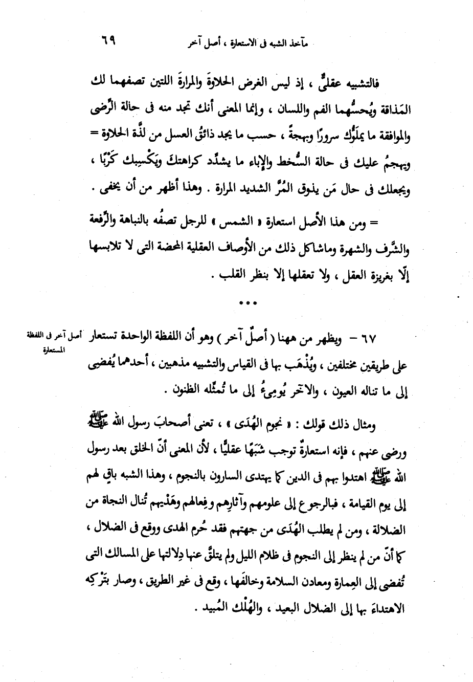 فالتشبيه عقليٌّ، إذ ليس الغرض الحلاوةَ والمرارةَ اللتين تصفهما لك المَذاقة ويُحسُّهما الفم واللسان، وإنما المعنى أنك تجد منه في حالة الرِّضى والموافقة ما يملَؤُك سروراً وبهجةً، حسب ما يجد ذائق العسل من لذَّة الحلاوة ويهجمُ عليك في حالة السُّخط والإباء ما يشدِّد كراهتَكَ ويَكْسِبك كَرْباً، ويجعلك في حال من يذوق المُرَّ الشديد المرارة، وهذا أظهر من أن يخفى، ومن هذا الأصل استعارة الشمس للرجل تصفُه بالنباهة والرُّفعة والشَّرف والشهرة وما شاكل ذلك من الأوصاف العقلية المحضة التي لا تلابسها إلاّ بغريزة العقل، ولا تعقلها إلا بنظر القلب، ويظهر من هاهنا " أصل آخر " وهو أنّ اللفظة الواحدة تستعار على طريقين مختلفين، ويُذْهَب بها في القياس والتشبيه مذهبين، أحدهما يُفضِي إلى ما تناله العيون، والآخر يُومِئُ إلى ما تُمثِّله الظنون، ومثال ذلك قولك: نجوم الهُدَى، تعني أصحاب الرسول صلى الله عليه وسلم ورضي عنهم، فإنه استعارةٌ توجب شَبَهاً عقليّاً، لأن المعنى أنّ الخلق بعد رسول الله صلى الله عليه وسلم اهتدوا بهم في الدين كما يهتدي السارون بالنجوم، وهذا الشبه باقٍ لهم إلى يوم القيامة، فبالرجوع إلى علومهم وآثارِهم وفِعالهم وهَدْيهم تُنال النجاة من الضلالة، ومن لم يطلب الهُدَى من جهتهم فقد حُرم الهدَى ووقع في الضلال، كما أنّ من لم ينظر إلى النجوم في ظلام اللّيل ولم يتلقَّ عنها دلالتها على المسالك التي تُفضي إلى العِمارة ومعادن السلامة وخالفَها، وقع في غير الطريق، وصار بَترْكِهِ الاهتداء بها إلى الضلال البعيد، والهُلْك المُبيد،