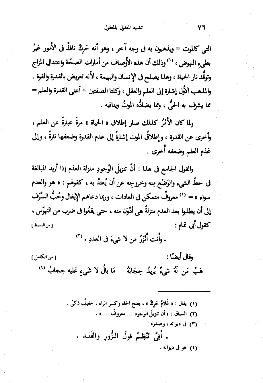التي كالموت ويذهبون به في وجه آخر، وهو أنه حَرِكٌ نافذٌ في الأمورِ غيرُ بطيءِ النهوض وذلك أن هذه الأوصاف من أمارات الصحة واعتدال المزاج وتوقُّد نار الحياة، وهذا يصلح في الإنسان والبهيمة، لأنه تعريض بالقدرة والقوة، والمذهب الأول إشارة في العلم والعقل، وكلتا الصفتين أعني القدرة والعلم مما يشرف به الحيُّ، ومما يضادُّه الموتُ وينافيه، ولما كان الأمْرُ كذلك صار إطلاق الحياة مرة عبارةً عن العلم، وأخرى عن القدرة وإطلاقُ الموت إشارةً إلى عدم القدرة وضعفها تارةً، وإلى عدم العلم وضعفه أخرى، والقول الجامع في هذا: أنّ تنزيلَ الوُجود منزلة العدَم إذا أريد المبالغة في حطّ الشيء والوَضْع منه وخروجِه عن أن يُعتدَّ به، كقولهم: هو والعدم سواء معروفٌ متمكن في العادات، وربما دعاهم الإيغال وحُبُّ السَّرَف إلى أن يطلبوا بعد العدم منزلةً هي أدْوَن منه، حتى يقعُوا في ضرب من التهوّس، كقول أبي تمام: