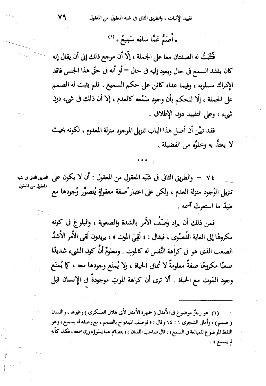 " أَصَمُّ عَمَّا سَاءَه سَمِيعُ " فَتُثْبَتُ له الصفتان معاً على الجملة، إلاّ أن مرجع ذلك إلى أن يقال إنه كان يفقد السمع في حال ويعود إليه في حال أو أنه في حقّ هذا الجنس فاقد الإدراك مسلوبه، وفيما عداه كائن على حكم السميع، فلم يثبت له الصمم على الجملة، إلاّ للحكم بأن وجود سَمْعه كالعدم، إلا أن ذلك في شيء دون شيء، وعلى التقييد دون الإطلاق، فقد تبيَّن أن أصل هذا الباب تنزيل الموجود منزلة المعدوم، لكونه بحيث لا يعتدُّ به وخلِّوه من الفضيلة، والطريق الثاني في شَبَه المعقول من المعقول: أن لا يكون على تنزيل الوُجود منزلة العدم، ولكن على اعتبار صفة معقولةٍ يُتصوَّر وُجودها مع ضِدّ ما استعرتَ اسمه، فمن ذلك أن يراد وَصْفُ الأمر بالشدة والصعوبة، وبالبلوغِ في كونه مكروهاً إلى الغاية القُصْوَى، فيقال: لَقِيَ الموت، يريدون لَقَي الأمر الأشدَّ الصعب الذي هو في كراهة النَّفس له كالموت، ومعلومٌ أنَّ كون الشيء شديداً صعباً مكروهاً صفةٌ معلومةٌ لا تُنافي الحياة، ولا يُمْنَع وجودها معه، كما يُمنَع وجود المَوت مع الحياة ألا ترى أن كراهة الوتِ موجودةٌ في الإنسان قبل