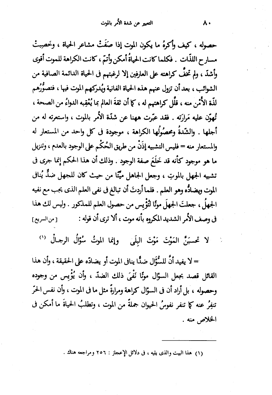 كأنه قد خَلَعَ صفة الوجود، وذلك أن هذا الحكم إنما جرى في تشبيه الجهل بالموتِ، وجعل الجاهل ميّتاً من حيث كان للجهل ضدٌُّ يُنافي الموت ويضادُّه وهو العلم، فلما أردتَ أن تبالغ في نفي العلم الذي يجب مع نفيه الجهلُ، وجعلتَ الجهلَ موتاً لتُؤْيس من حصول العلم للمذكور، وليس لك هذا في وصف الأمر الشديد المكروه بأنه موت، ألا ترى أن قوله: هـ قد خَلَعَ صفة الوجود، وذلك أن هذا الحكم إنما جرى في تشبيه الجهل بالموتِ، وجعل الجاهل ميّتاً من حيث كان للجهل ضدٌُّ يُنافي الموت ويضادُّه وهو العلم، فلما أردتَ أن تبالغ في نفي العلم الذي يجب مع نفيه الجهلُ، وجعلتَ الجهلَ موتاً لتُؤْيس من حصول العلم للمذكور، وليس لك هذا في وصف الأمر الشديد المكروه بأنه موت، ألا ترى أن قوله: