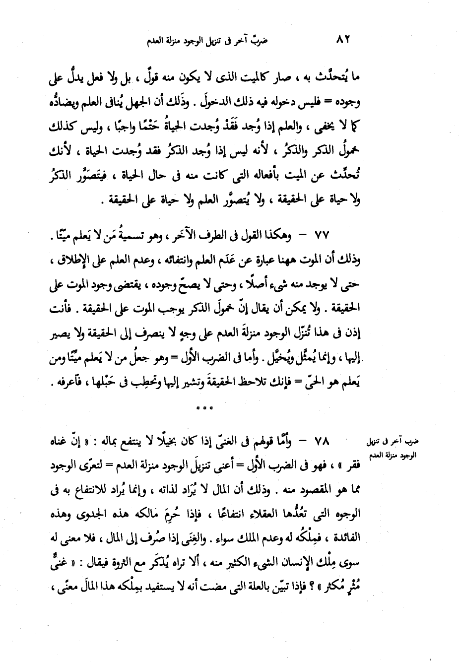 ما يُتحدَّث به، صار كالميت الذي لا يكون منه قولٌ، بل ولا فعل يدلُّ على وجوده فليس دخوله فيه ذلك الدخولَ، وذلك أن الجهل يُنافي العلم ويضادُّه كما لا يخفى، والعلم إذا وُجد فَقَدْ وُجدت الحياةُ حَتْمَاً واجباً، وليس كذلك خمولُ الذكر والذكرُ، لأنه ليس إذا وُجد الذكرُ فقد وُجدت الحياة، لأنك تُحدِّث عن الميت بأفعاله التي كانت منه في حال الحياة، فيَتَصَوَّر الذكرُ ولا حياة على الحقيقة، ولا يُتَصَوَّر العلم ولا حياة على الحقيقة. وهكذا القول في الطرف الآخر، وهو تسميةُ مَنْ لا يَعلم ميّتاً، وذلك أن الموت ها هنا عبارة عن عَدَم العلم وانتفائه، وعدم العلم على الإطلاق، حتى لا يوجد منه شيء أصلاً، وحتى لا يصحّ وجوده، يقتضي وجود الموت على الحقيقة ولا يمكن أن يقال إنّ خمولَ الذكر يوجب الموت على الحقيقة، فأنت إذن في هذا تُنزّل الوجود منزلةَ العدم على وجهٍ لا ينصرف إلى الحقيقة ولا يصير إليها،، وإنما يُمثَّل ويُخيَّل، وأما في الضرب الأول وهو جعلُ من لا يعلم ميِّتاً ومن يعَلم هو الحيّ فإنك تلاحظ الحقيقة وتشير إليها وتحطِب في حَبْلها فاعرفه. وأمَّا قولهم في الغنيّ إذا كان بخيلاً لا ينتفع بماله: إنّ غناه فقر، فهو في الضرب الأول أعني تنزيلَ الوجود منزلة العدم لتعرّى الوجود مما هو المقصود منه، وذلك أن المال لا يُراد لذاته، وإنما يُراد للانتفاع به في الوجوه التي تعدُّها العقلاء انتفاعاً، فإذا حُرم مالكه هذه الجدوى وهذه الفائدة، فملْكُه له وعدم الملك سواء، والغِنَي إذا صُرف إلى المال، فلا معنى له سوى مِلْك الإنسان الشيء الكثير منه، ألا تراه يُذكَر مع الثروة فيقال: غنيٌّ مُثْرٍ مُكثر؟ فإذا تبين بالعلة التي مضت أنه لا يستفيد بمِلْكه هذا المالَ معنًى،