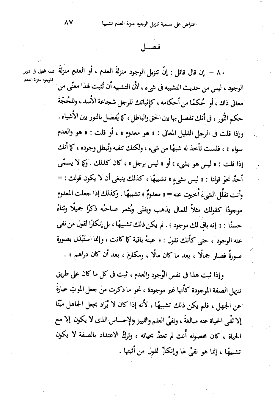 إن قال قائل: إنّ تنزيل الوجود منزلةَ العدم، أو العدِم منزلةَ الوجود، ليس من حديث التشبيه في شيء، لأن التشبيه أن تثبت لهذا معنًى من معاني ذاك، أو حُكماً من أحكامه، كإثباتك للرجل شجاعة الأسد، وللحُجة حكم النُّور، في أنك تفصل بها بين الحق والباطل، كما يُفصل بالنور بين الأشياء، وإذا قلت في الرجل القليل المعاني: هو معدوم، أو قلت: هو والعدم سواء، فلست تأخذ له شبهاً من شيء، ولكنك تنفيه وتُبطل وجوده، كما أنك إذا قلت: ليس هو بشيء أو ليس برجل، كان كذلك، وكما لا يسمّى أحدٌ نحوَ قولنا: ليس بشيء تشبيهاً، كذلك ينبغي أن لا يكون قولك: وأنت تقلِّل الشيءَ أُخبرت عنه معدومٌ تشبيهاً، وكذلك إذا جعلت المعدوم موجوداً كقولك مثلاً للمال يذهب ويفنَى ويُثمر صاحبهُ ذكراً جميلاً وثناءً حسناً: إنه باقٍ لك موجود، لم يكن ذلك تشبيهاً، بل إنكاراً لقول من نفى عنه الوجود، حتى كأنك تقول: عينُه باقية كما كانت، وإنما استَبْدَل بصورة صورةً فصار جمالاً، بعد ما كان مالاً، ومكارمَ، بعد أن كان دراهم، وإذا ثبت هذا في نفس الوُجود والعدم، ثبت في كل ما كان على طريق تنزيل الصفة الموجودة كأنها غير موجودة، نحو ما ذكرت من جعل الموت عبارةً عن الجهل، فلم يكن ذلك تشبيهاً، لأنه إذا كان لا يُرَاد بجعل الجاهل ميّتاً إلا نفْي الحياة عنه مبالغةً، ونفيُ العلم والتمييز والإحساس الذي لا يكون إلا مع الحياة، كان محصوله أنك لم تعتدُّ بحياته، وتركُ الاعتداد بالصفة لا يكون تشبيهاً، إنما نفيٌ لها وإنكارٌ لقول من أثبتها،