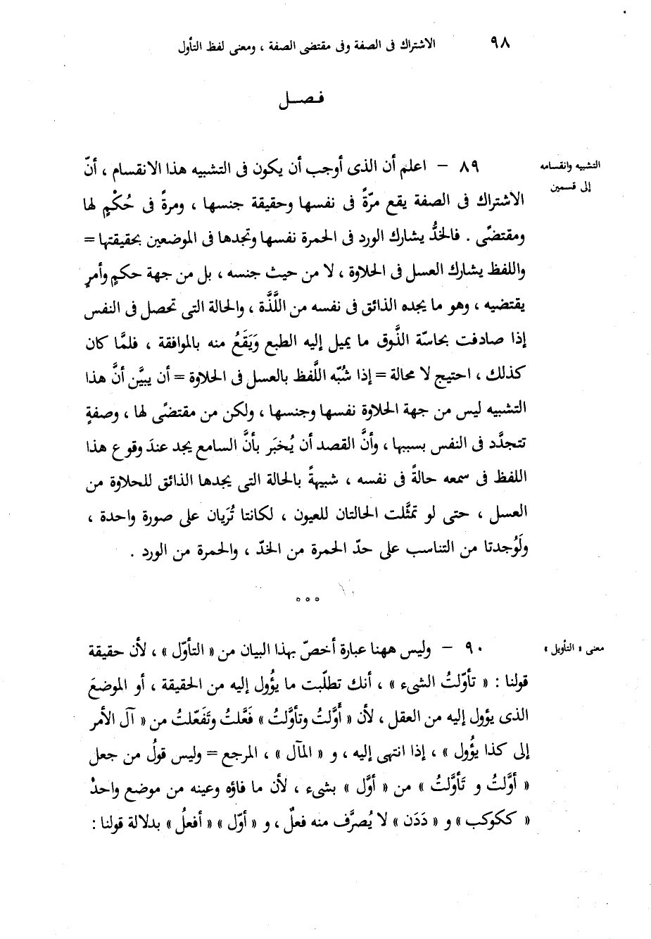 اعلم أن الذي أوجب أن يكون في التشبيه هذا الانقسام، أنّ الاشتراك في الصفة يقع مرّةً في نفسها وحقيقة جنسها، ومرةً في حُكْمٍ لها ومقتضًى، فالخدُّ يشارك الورد في الحمرة نفسها وتجدها في الموضعين بحقيقتها واللفظ يشارك العسل في الحلاوة، لا من حيث جنسه، بل من جهة حكمٍ وأمرٍ يقتضيه، وهو ما يجده الذائق في نفسه من اللَّذَّة، والحالة التي تحصل في النفس إذا صادفت بحاسّة الذَّوق ما يميل إليه الطبع وَيَقَعُ منه بالموافقة، فلمَّا كان كذلك، احتيج لا محالة إذا شُبّه بالعسل في الحلاوة أن يبيَّن أنَّ هذا التشبيه ليس من جهة الحلاوة نفسها وجنسها، ولكن من مقتضًى لها، وصفةٍ تتجدَّد في النفس بسببها، وأنَّ القصد أن يُخبَر بأنَّ السامع يجد عندَ وقوع هذا اللفظ في سمعه حالةً في نفسه، شبيهةً بالحالة التي يجدها الذائق للحلاوة من العسل، حتى لو تمثَّلت الحالتان للعيون، لكانتا تُرَيان على صورة واحدة، ولَوُجدتا من التناسب على حدّ الحمرة من الخدّ، والحمرة من الورد، وليس ها هنا عبارة أخصّ بهذا البيان من التأوّل، لأن حقيقة قولنا: تأوّلتُ الشيء، أنك تطلّبت ما يؤُول إليه من الحقيقة، أو الموضعَ الذي يؤول إليه من العقل، لأن أوَّلتُ وتأوَّلتُ فَعَّلتُ وتَفَعّلتُ من آل الأمر إلى كذا يؤُول، إذا انتهى إليه، والمآل، المرجع وليس قولُ من جعل أوَّلتُ وتأَوَّلتُ من أَوَّل بشيء، لأن ما فاؤه وعينه من وضع واحد ككوكب ودَدَن لا يُصرَّف منه فعلٌ، وأوّل أفعلُ بدلالة قولنا: