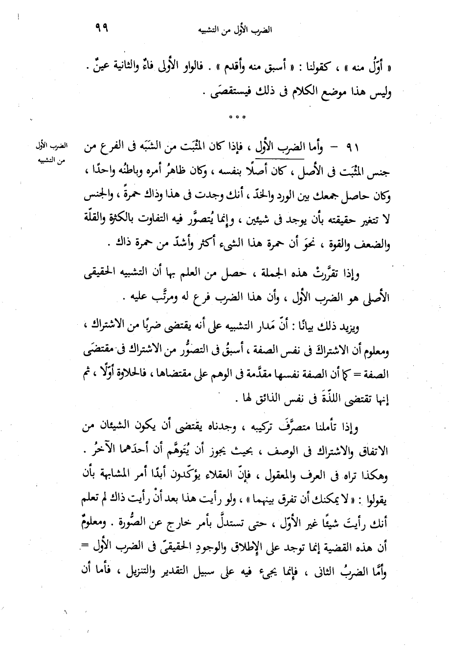 أوّلُ منه، كقولنا: أسبق منه وأقدم، فالواو الأولى فاءٌ والثانية عينٌ وليس هذا موضع الكلام في ذلك فيستقصَى، وأما الضرب الأول، فإذا كان المثْبَت من الشَبَه في الفرع من جنس المثْبَت في الأصل، كان أصلاً بنفسه، وكان ظاهرُ أمره وباطنُهُ واحداً، وكان حاصل جمعك بين الورد والخد، أنك وجدت في هذا وذاك حمرةً، والجنس لا تتغير حقيقته بأن يوجد في شيئان، وإنما يُتصوَّر فيه التفاوت بالكثرة والقلّة والضعف والقوة، نحوَ أن حمرةَ هذا الشيء أكثر وأشد من حمرة ذاك، وإذا تقرَّرتْ هذه الجملة، حصل من العلم بها أن التشبيه الحقيقي الأصلي هو الضرب الأول، وأن هذا الضرب فرع له ومرتَّب عليه، ويزيد ذلك بياناً: أنّ مدار التشبيه على أنه يقتضي ضرباً من الاشتراك، ومعلوم أن الاشتراك في نفس الصفة، أسبقُ في التصوُّر من الاشتراك في مقتضَى الصفة كما أن الصفة نفسها مقدَّمة في الوهم على مقتضاها، فالحلاوة أوّلاً، ثم إنها تقتضي اللذّة في نفس الذائق لها، وإذا تأملنا متصرَّف تركيبه، وجدناه يقتضي أن يكون الشيئان من الاتفاق والاشتراك في الوصف، بحيث يجوز أن يُتَوهَّم أن أحدَهما الآخرُ، وهكذا تراه في العرف والمعقول، فإنّ العقلاء يؤكّدون أبداً أمر المشابهة بأن يقولوا: لا يمكنك أن تفرق بينهما، ولو رأيت هذا بعد أنْ رأيت ذاك لم تعلم أنك رأيت شيئاً غير الأوّل، حتى تستدلَّ بأمر خارج عن الصُّورة، ومعلومٌ أن هذه القضية إنما توجد على الإطلاق والوجودِ الحقيقيِ في الضرب الأول وأمَّا الضربُ الثاني، فإنما يجيء فيه على سبيل التقدير والتنزيل، فأما أن