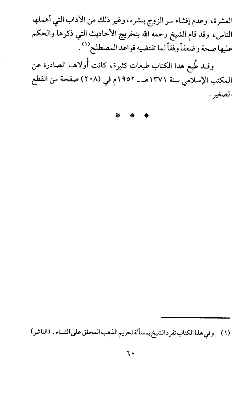 (1) وفي هذا ا لكتاب تفرد ا لشيخ بمسالة تحريم ا لذهب المحلق على ا لنساء. (ا لنا شر)