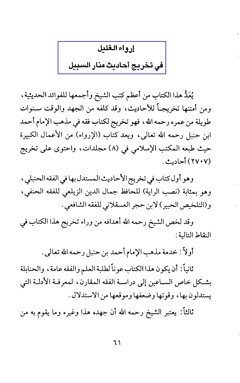 ابن حنبل رحمه الله تعالى، ويعد كتاب (الإرواء) من الاعمال الكبيرة