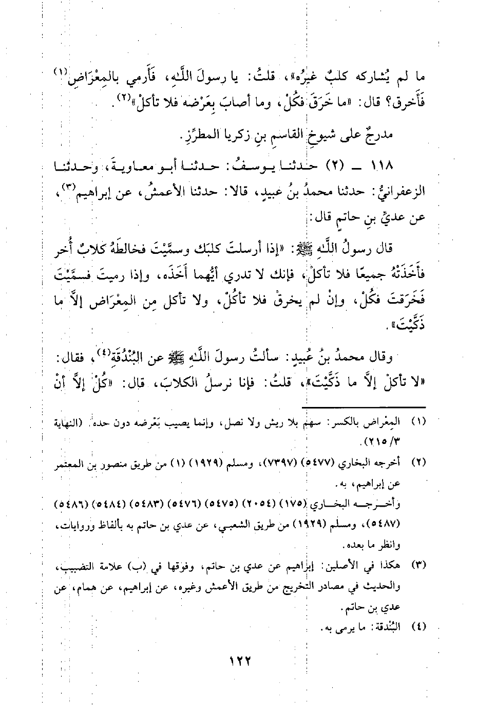 118 - (2) حدثنا يوسف: حدثنا أبو معاوية، وحدثنا الزعفراني: حدثنا محمد بن عبيد، قالا: حدثنا الأعمش، عن إبراهيم، عَنْ عَدِيِّ بْنِ حَاتِمٍ قَالَ: قال رسول الله صلى الله عليه وسلم: إذا أرسلت كلبك وسميت فخالطه كلاب أخر فأخذته جميعا فلا تأكل، فإنك لا تدري أيهما أخده، وإذا رميت فسميت فخرقت فكل، وإن لم يخرق فلا تأكل، ولا تأكل من المعراض إلا ما ذكيت.