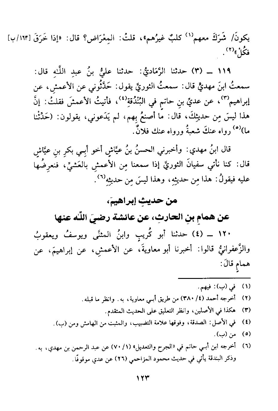 119 - (3) حدثنا الرمادي: حدثنا علي بن عبد الله قال: سمعت ابن مهدي قال: سمعت الثوري يقول: حدثوني عن الأعمش، عن إبراهيم، عن عدي بن حاتم في البندقة، فأتيت الأعمش فقلت: إن هذا ليس من حديثك، قال: ما أصنع بهم، لم يدعوني، يقولون: [حدثنا ما] رواه عنك شعبة ورواه عنك فلان.