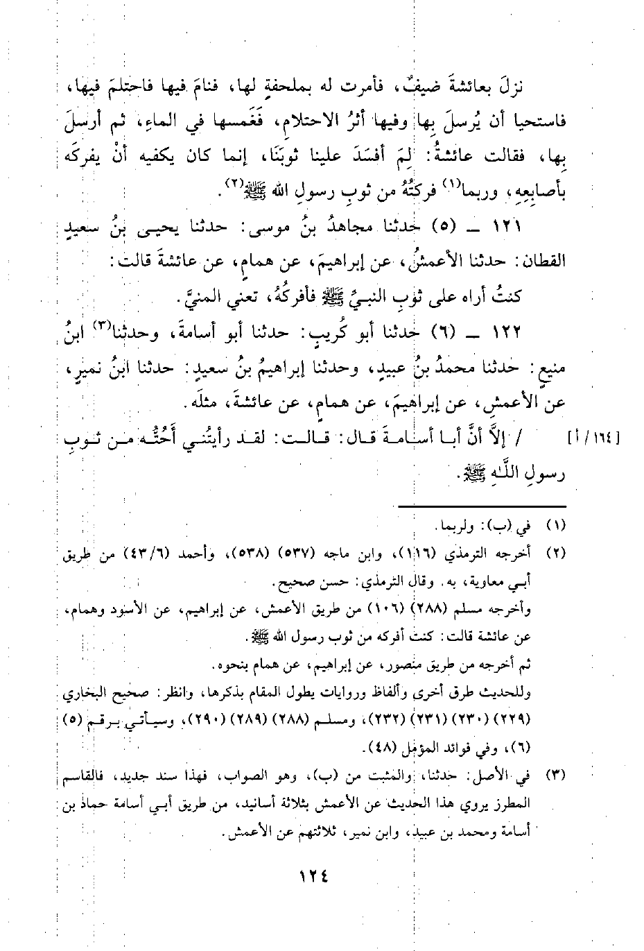 121 - (5) حَدَّثَنَا مجاهد بن موسى: حَدَّثَنَا يَحْيَى بْنُ سَعِيدٍ الْقَطَّانُ: حَدَّثَنَا الأَعْمَشُ، عن إبراهيم، عن همام، عن عائشة قالت: كنت أراه على ثوب النَّبِيّ صَلَّى اللَّهُ عَلَيْهِ وَسَلَّمَ فأفركه، تعني المني.