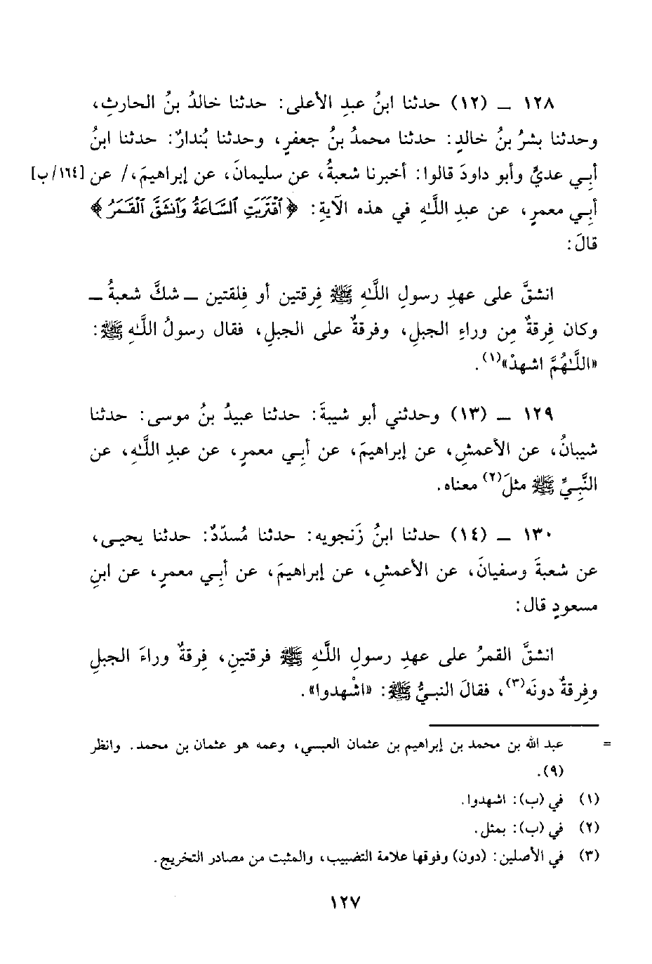 128 - (12) حدثنا ابن عبد الأعلى: حدثنا خالد بن الحارث، وحدثنا بشر بن خالد: حدثنا محمد بن جعفر، وحدثنا بندار: حدثنا ابن أبي عدي وأبو داود قالوا: حدثنا شعبة، عن سليمان، عن إبراهيم، / عن أبي معمر، عن عبد الله في هذه الآية: {اقتربت الساعة وانشق القمر} قال: انشق عَلى عهد رسول الله صلى الله عليه وسلم فرقتين أو فلقتين - شك شعبة - وكان فرقة من وراء الجبل، وفرقة على الجبل، فَقَالَ رسول الله صلى الله عليه وسلم: اللهم اشهد.