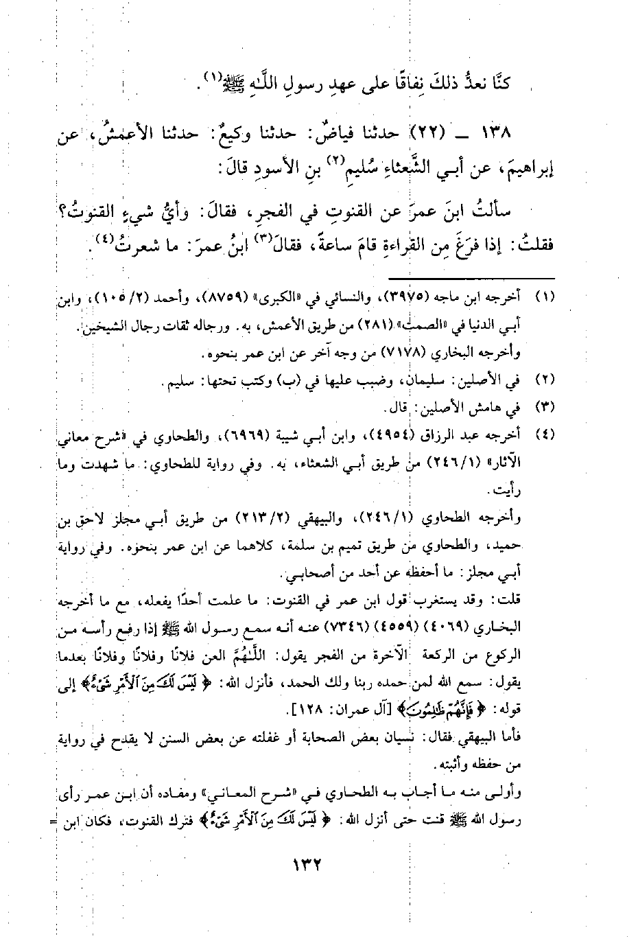 138 - (22) حَدَّثَنَا فياض: حدثنا وكيع: حدثنا الأعمش، عن إبراهيم، عن أبي الشعثاء سليم بن الأسود قال: سألت ابن عمر عن القنوت في الفجر، فقال: وأي شيء القنوت؟ فقلت: إذا فرغ من القراءة قام ساعة، فقال ابن عمر: ما شعرت.
