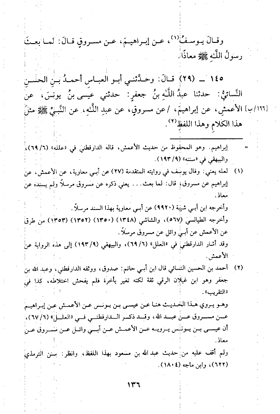 145 - (29) قال: وحدثني أبو العباس أحمد بن الحسن النسائي: حدثنا عبد الله بن جعفر: حدثني عيسى بن يونس، عن الأعمش، عن إبراهيم، / عن مسروق، عن عبد الله، عَنِ النَّبِيِّ صَلَّى اللَّهُ عَلَيْهِ وَسَلَّمَ مِثْلَ هذا الكلام وهذا اللفظ.