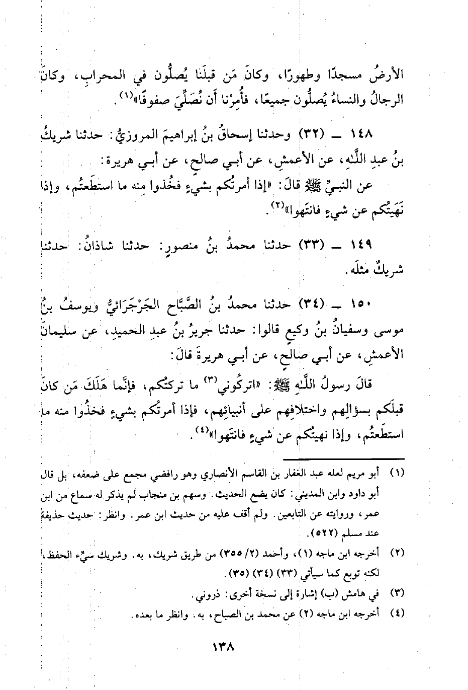 150 - (34) حدثنا محمد بن الصباح الجرجرائي ويوسف بن موسى وسفيان بن وكيع قالوا: حدثنا جرير بن عبد الحميد، عن سليمان الأَعْمَشِ، عَنْ أَبِي صَالِحٍ، عَنْ أَبِي هُرَيْرَةَ قَالَ: قَالَ رَسُول اللَّهِ صَلَّى اللَّهُ عَلَيْهِ وسلم: اتركوني ما تركتكم، فإنما هلك من كان قبلكم بسؤالهم واختلافهم على أنبيائهم، فإذا أمرتكم بشيء فخذوا منه ما أستطتعم، وإذا نهيتكم عن شيء فانتهوا.