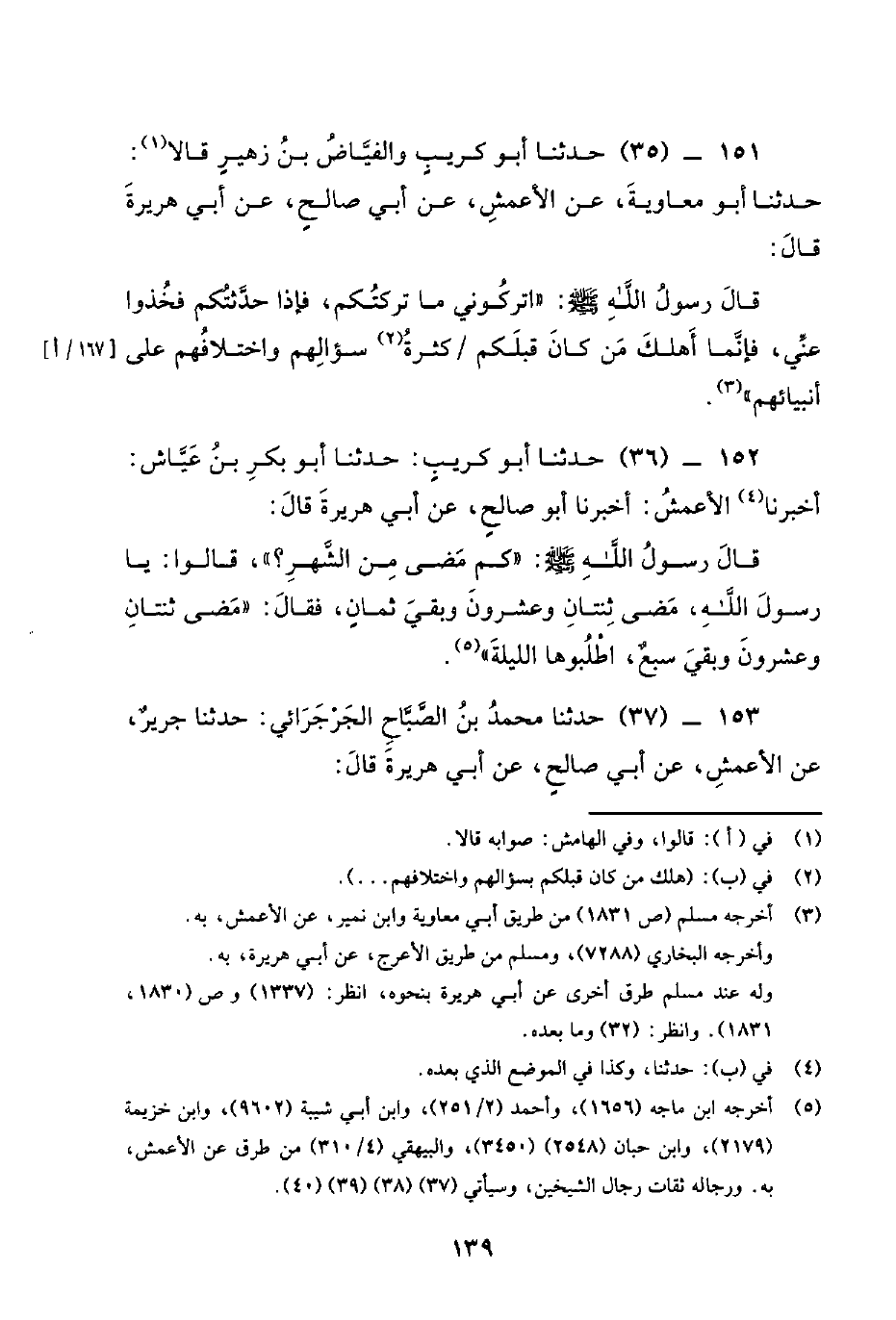151 - (35) حدثنا أبو كريب والفياض بن زهير قالا: حدثنا أبو معاوية، عن الأعمش، عن أبي صالح، عن أبي هريرة قال: قال رسول اللَّهِ صَلَّى اللَّهُ عَلَيْهِ وسلم: اتركوني ما تركتكم، فإذا حدثتكم فخذوا عني، فإنما أهلك من كان قبلكم / كثرة سؤالهم واختلافهم على أنبيائهم.
