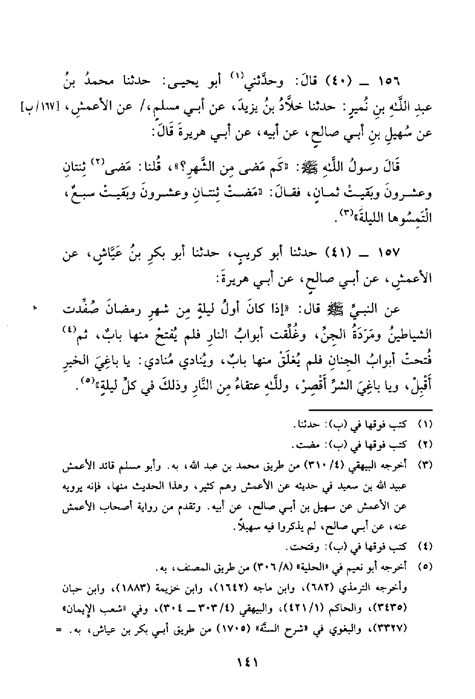 157 - (41) حدثنا أبو كريب، حدثنا أبو بكر بن عَيَّاشٍ، عَنِ الأَعْمَشِ، عَنْ أَبِي صَالِحٍ، عَنْ أَبِي هُرَيْرَةَ. عَنِ النَّبِيِّ صَلَّى اللَّهُ عَلَيْهِ وَسَلَّمَ قَالَ: إِذَا كَانَ أول ليلة من شهر رمضان صفدت الشياطين ومردة الجن، وغلقت أبواب النار فلم يفتح منها باب، ثم فتحت أبواب الجنان فلم يغلق منها باب، وينادي منادي: يا باغي الخير أقبل، ويا باغي الشر أقصر، ولله عتقاء من النار وذلك في كل ليلة.