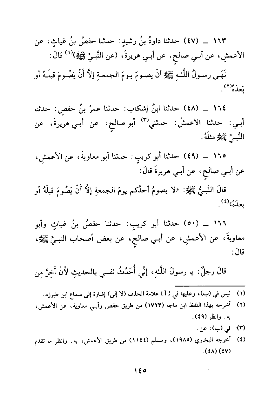 163 - (47) حدثنا داود بن رشيد: حدثنا حفص بن غياث، عَنِ الأَعْمَشِ، عَنْ أَبِي صَالِحٍ، عَنْ أَبِي هُرَيْرَةَ، عَنِ النَّبِيِّ صَلَّى اللَّهُ عَلَيْهِ وَسَلَّمَ قَالَ: نَهَى رَسُول اللَّهِ صَلَّى اللَّهُ عَلَيْهِ وَسَلَّمَ إِنَّ يصوم يوم الجمعة إلا أن يصوم قبله أو بعده.