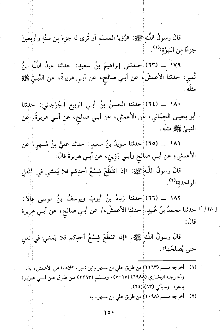 181 - (65) حدثنا سويد بن سعيد: حدثنا علي بن مسهر، عن الأعمش، عن أبي صالح وأبي رزين، عَنْ أَبِي هُرَيْرَةَ قَالَ: قَالَ رَسُول اللَّهِ صَلَّى اللَّهُ عَلَيْهِ وسلم: إذا انقطع شسع أحدكم فلا يمشي في النعل الواحدة.