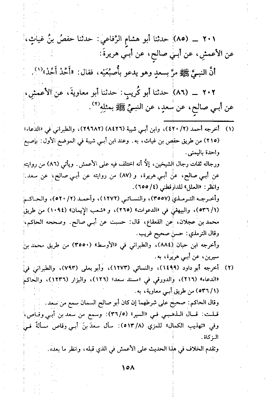 201 - (85) حدثنا أبو هشام الرفاعي: حدثنا حفص بن غياث، عَنِ الأَعْمَشِ، عَنْ أَبِي صَالِحٍ، عَنْ أَبِي هُرَيْرَةَ: أَنَّ النَّبِيَّ صَلَّى اللَّهُ عَلَيْهِ وَسَلَّمَ مر بسعد وهو يدعو بأصبعيه، فقال: أحد أحد.