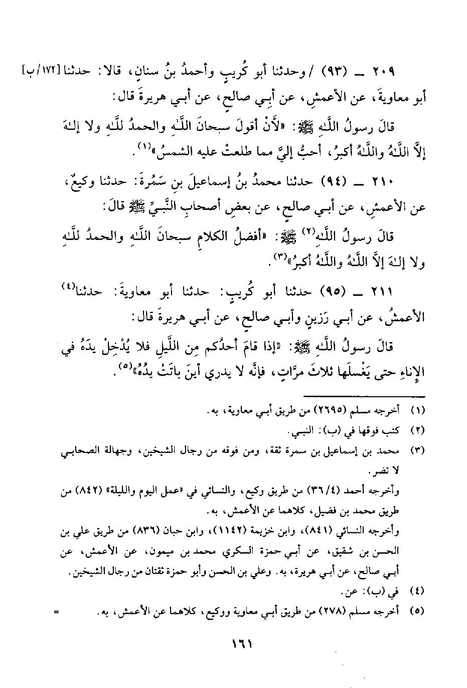 210 - (94) حدثنا محمد بن إسماعيل بن سمرة: حدثنا وكيع، عن الأعمش، عن أبي صالح، عن بَعْضِ أَصْحَابِ النَّبِيّ صَلَّى اللَّهُ عَلَيْهِ وَسَلَّمَ قال: قال رسول الله صلى الله عليه وَسَلَّمَ: أفضل الكلام سبحان الله والحمد لله ولا إله إلا الله والله أكبر.