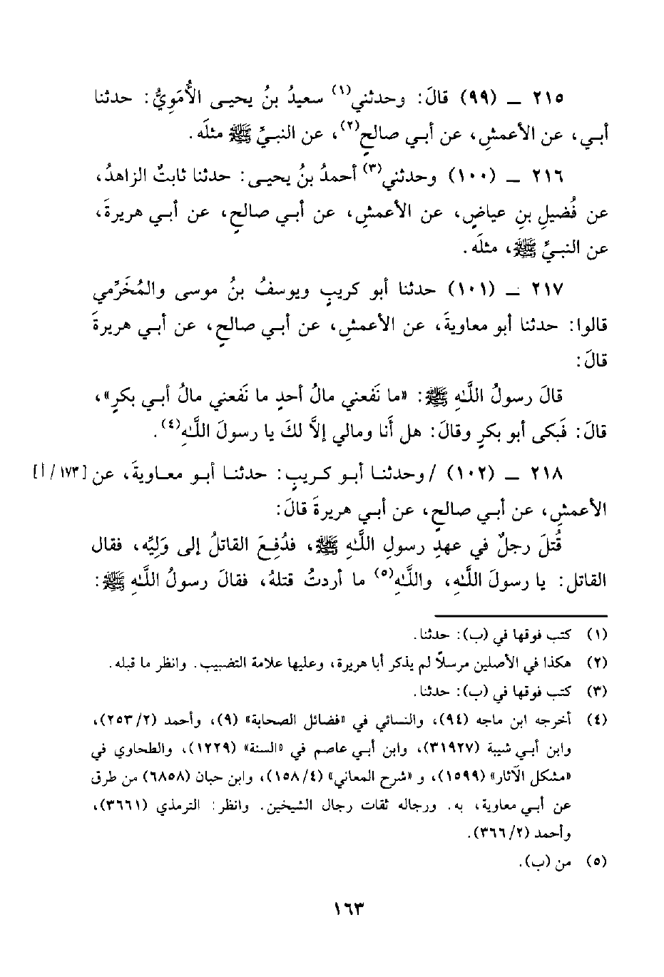 217 - (101) حدثنا أبو كريب ويوسف بن موسى والمخرمي قالوا: حدثنا أبو معاوية، عن الأعمش، عن أَبِي صَالِحٍ، عَنْ أَبِي هُرَيْرَةَ قَالَ: قَالَ رسول الله صلى الله عليه وسلم: ما نفعني مال أحد ما نفعني مال أبي بكر، قال: فبكى أبو بكر وقال: هل أنا ومالي إلا لك يا رسول الله.
