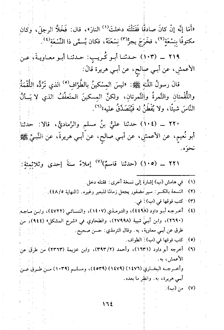219 - (103) حدثنا أبو كريب: حدثنا أبو معاوية، عن الأَعْمَشِ، عَنْ أَبِي صَالِحٍ، عَنْ أَبِي هُرَيْرَةَ قال: قال رسول الله صلى الله عليه وسلم: ليس المسكين بالطواف الذي ترده اللقمة واللقمتان والتمرة والتمرتان، ولكن المسكين المتعفف الذي لا يسأل الناس شيئا، ولا يفطن له فيتصدق عليه.