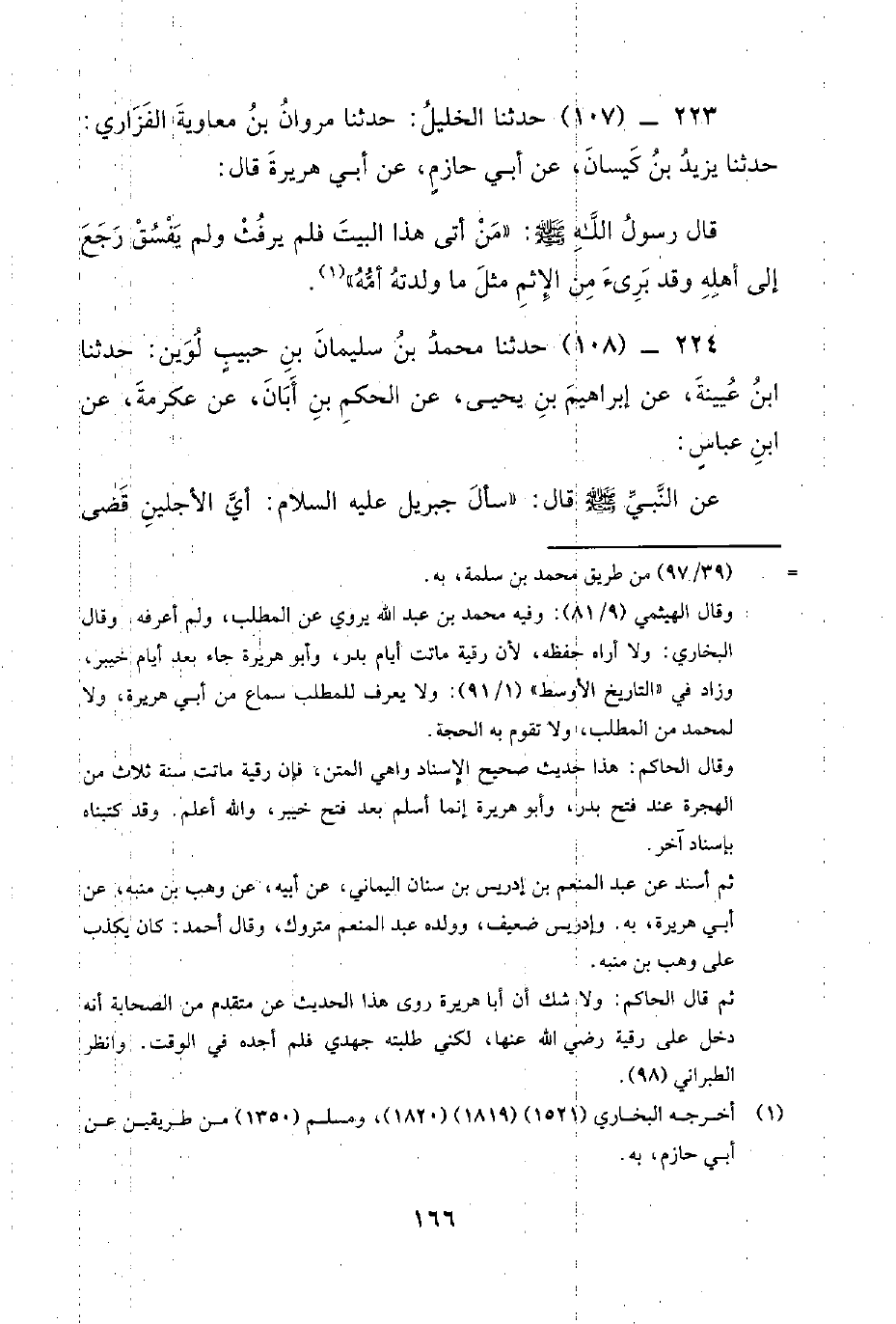 223 - (107) حدثنا الخليل حدثنا مروان بن معاوية الفزاري: حدثنا يزيد بن كيسان، عن أبي حازم، عن أبي هريرة قال: قال رسول الله صَلَّى اللَّهُ عَلَيْهِ وسلم: من أتى هذا البيت فلم يرفث ولم يفسق رجع إلى أهله وقد برئ من الإثم مثل ما ولدته أمه.