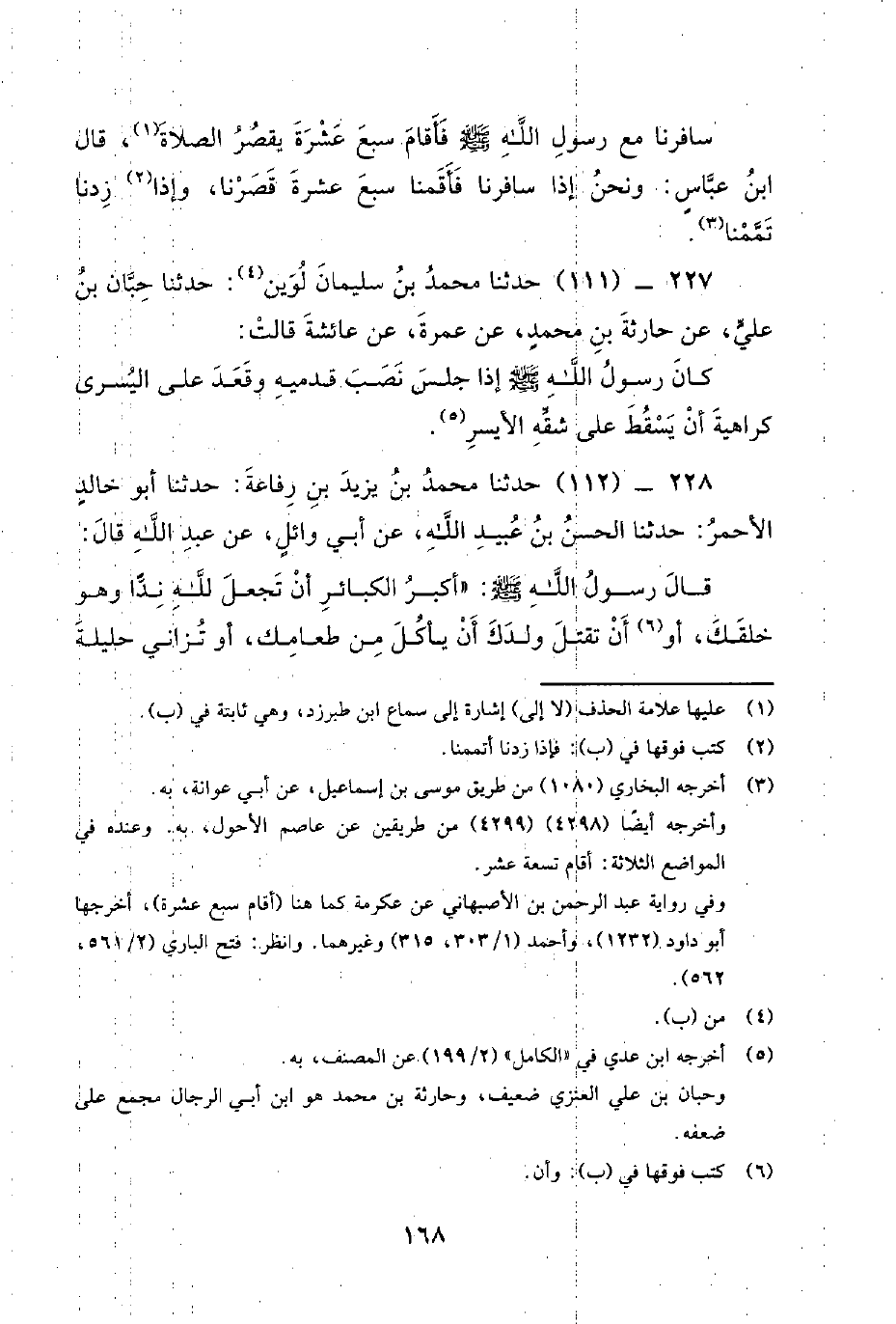 227 - (111) حدثنا محمد بن سليمان [لوين]: حدثنا حبان بن علي، عن حارثة بن محمد، عن عمرة، عَنْ عَائِشَةَ قَالَتْ: كَانَ رَسُولُ اللَّهِ صَلَّى اللَّهُ عَلَيْهِ وَسَلَّمَ إِذَا جلس نصب قدميه وقعد على اليسرى كراهية أن يسقط على شقه الأيسر.