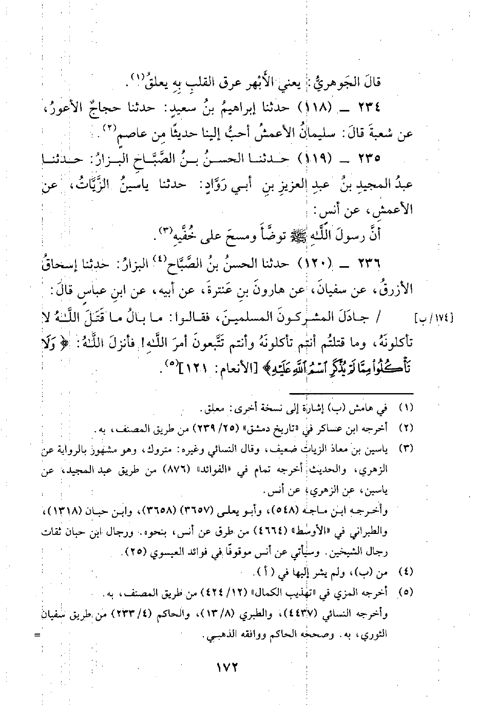 236 - (120) حدثنا الحسن بن [الصباح] البزار: حدثنا إسحاق الأزرق، عن سفيان، عَنْ هَارُونَ بْنِ عَنْتَرَةَ، عَنْ أَبِيهِ، عَنْ ابن عباس قال: / جادل المشركون المسلمين، فقالوا: ما بال ما قتل الله لا تأكلونه، وما قتلتم أنتم تأكلونه وأنتم تتبعون أمر الله! فأنزل الله: {ولا تأكلوا مما لم يذكر اسم الله عليه}.