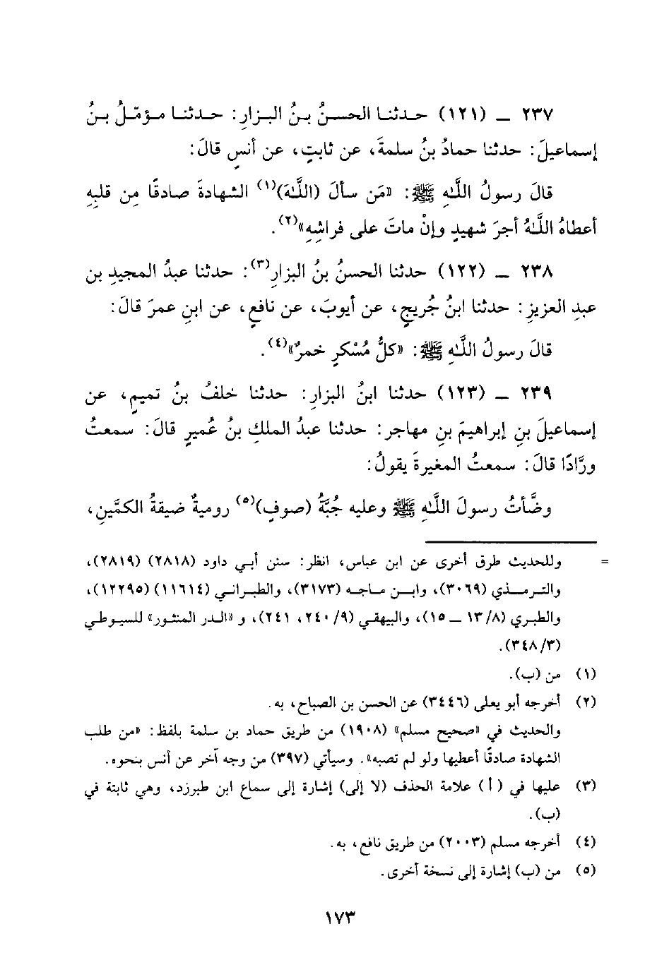 237 - (121) حدثنا الحسن بن البزار: حدثنا مؤمل بن إسماعيل: حدثنا حماد بن سلمة، عن ثابت، عَنْ أَنَسٍ قَالَ: قَالَ رَسُولُ اللَّهِ صَلَّى اللَّهُ عَلَيْهِ وسلم: من سأل [الله] الشهادة صادقا من قلبه أعطاه الله أجر شهيد وإن مات على فراشه.